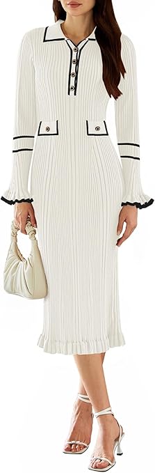 Pink Queen Women's V Neck Bodycon Sweater Dress 2024 Long Sleeve Half Button Slim Fitted Ruffle Ribbed Knit Maxi Pencil Dress