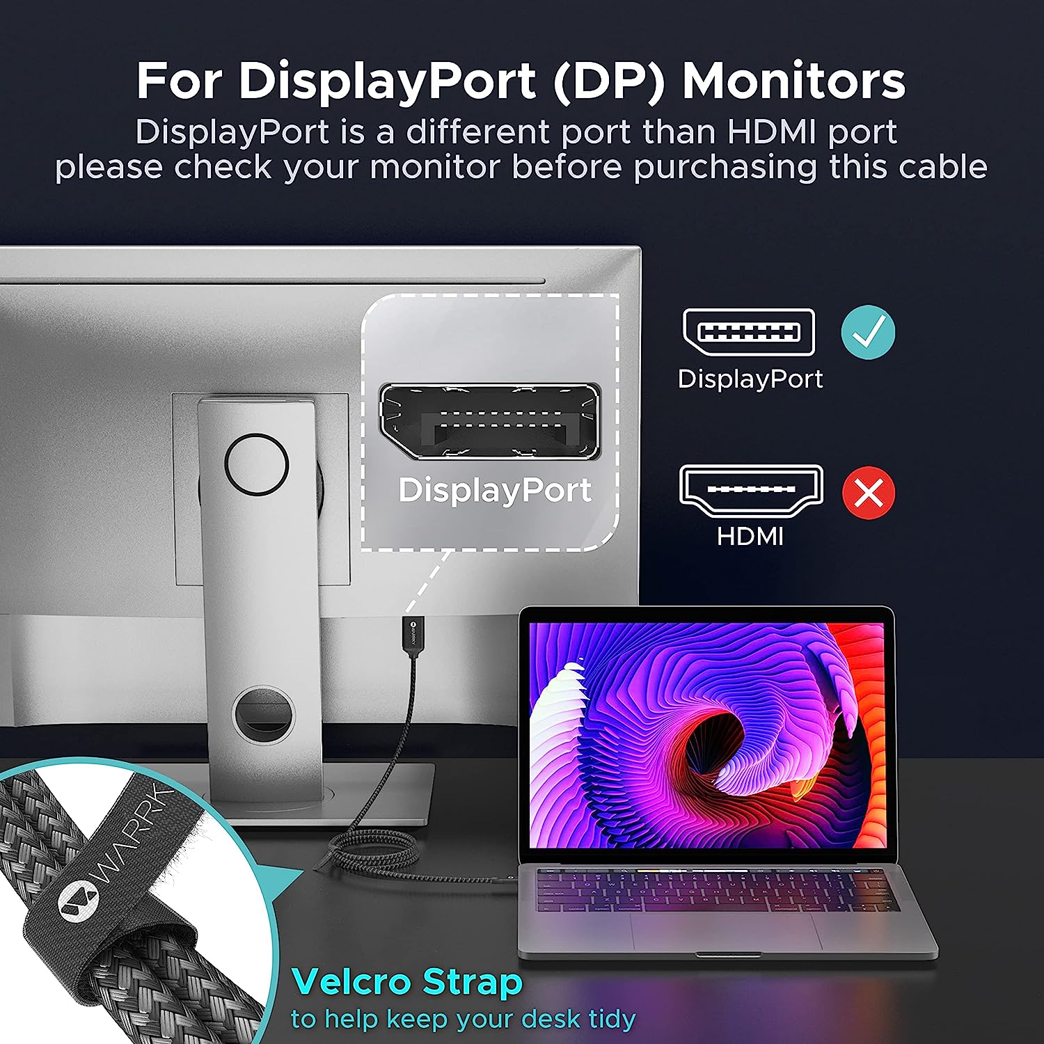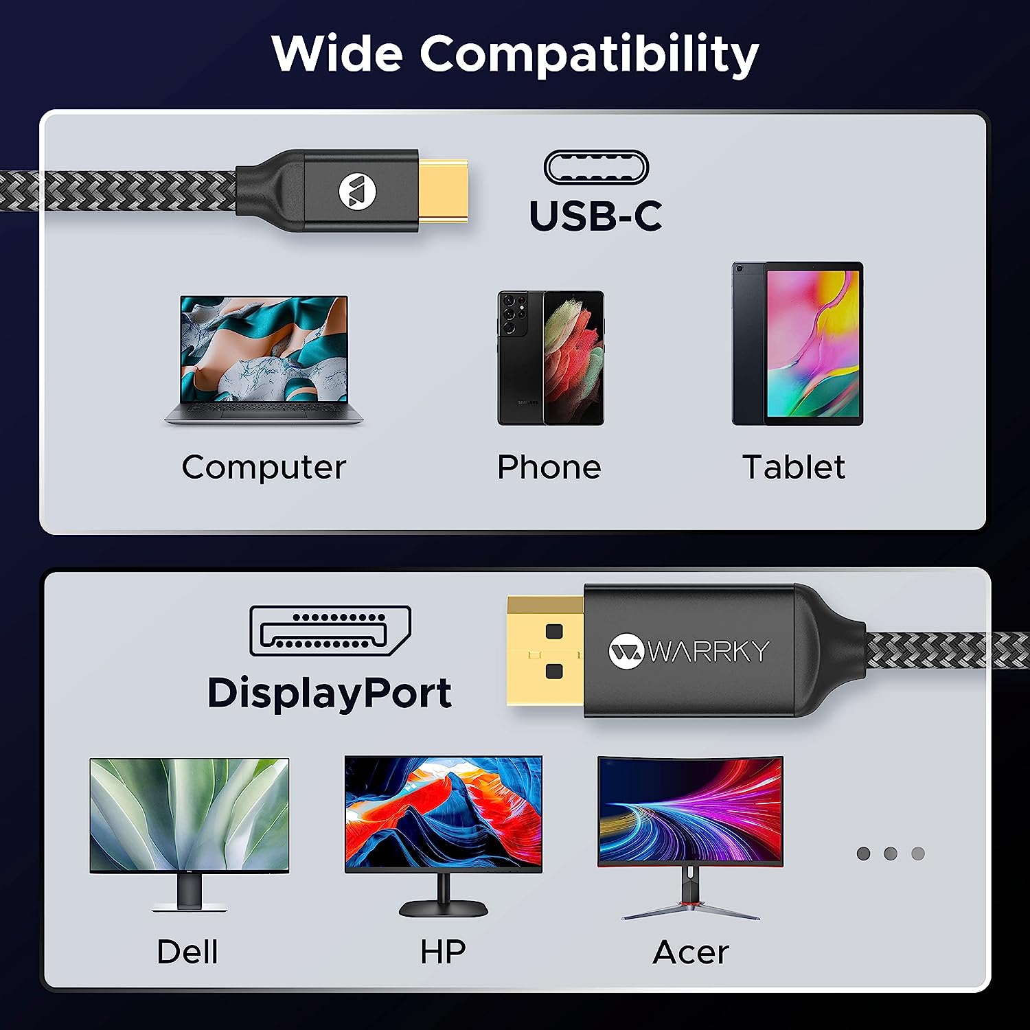 Warrky USB C to DisplayPort Cable 3.3FT / 1M (4K 60Hz, 2K 144Hz / 165Hz), [Gold-Plated Anti-Interference] Thunderbolt 3 and 4 Compatible Adapter for MacBook Pro/Air 2020, New iPad, XPS 15/13 - Active