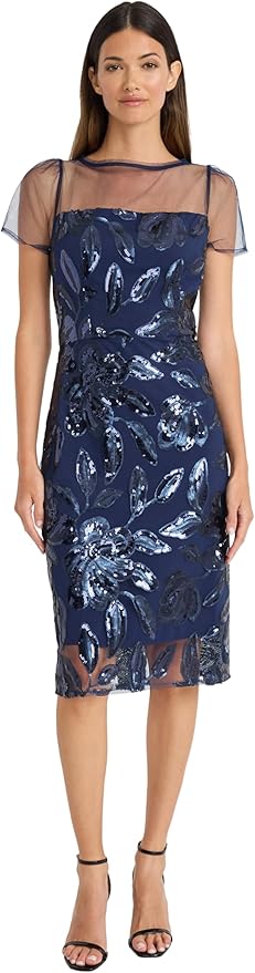 Maggy London Sequin Leaf Pattern Sheath Cocktail Dress for Women, Knee-Length Formal Wedding Guest and Prom Attire