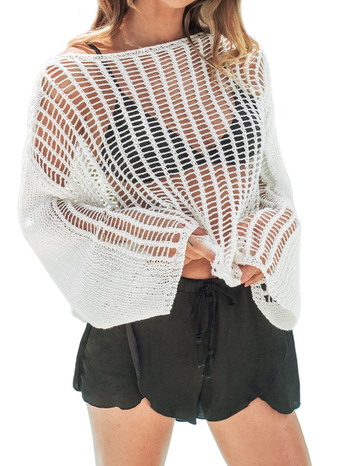 CUPSHE Women's Cutout Cover Up Crochet Swim Long Sleeve Pullover Tunic Coverups Top Beachwear White,M