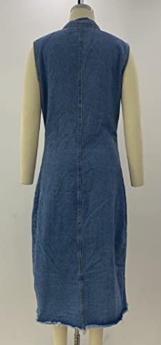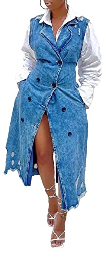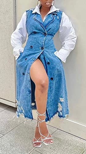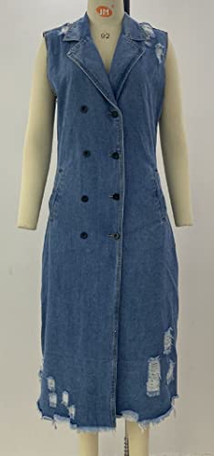 CHARTOU Women's Notched Collar Double Breasted Destroyed Holes Sleeveless Denim Vest Jacket (Medium, Blue)