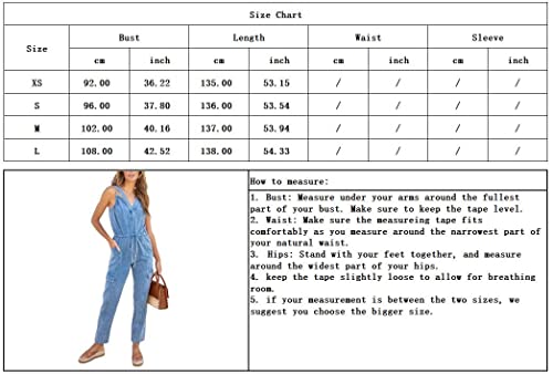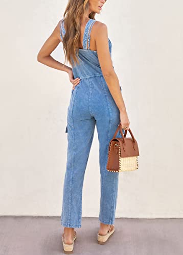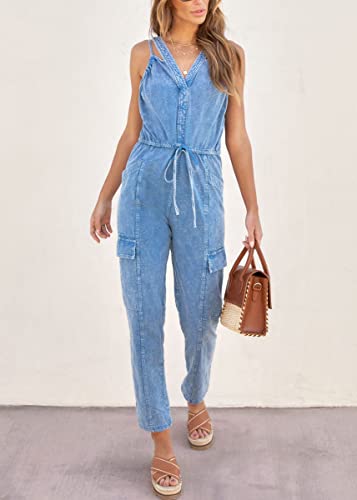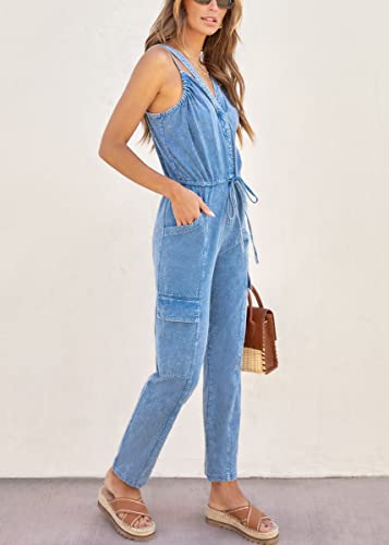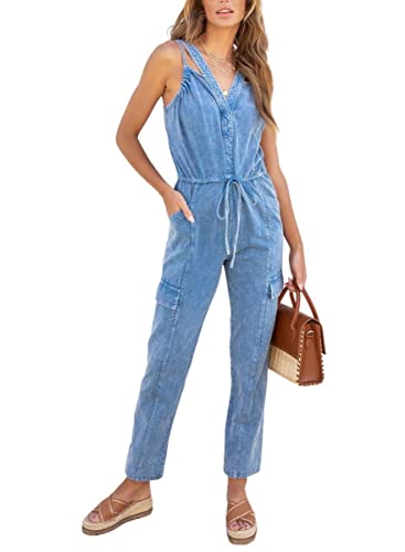 chouyatou Women's Washed Denim Jumpsuits V Neck Sleeveless Drawstring Pant Overall Rompers with Pockets (Medium, Blue)