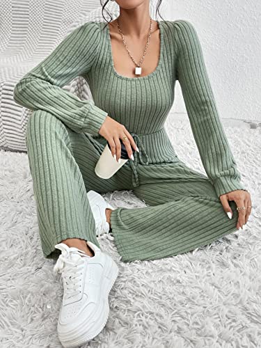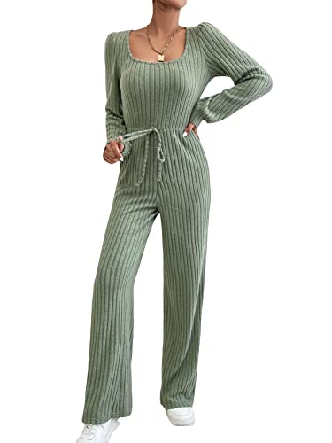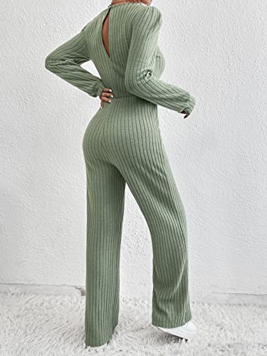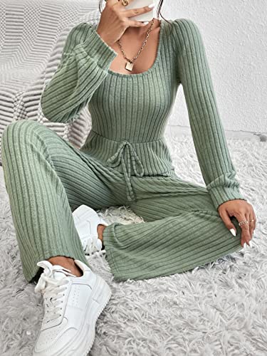 WDIRARA Women's Square Neck Knot Waist Long Sleeve Ribbed Knit Jumpsuit Pants Mint Green L