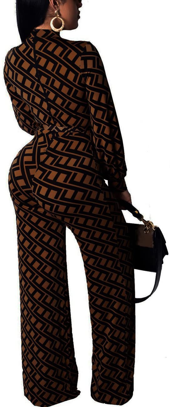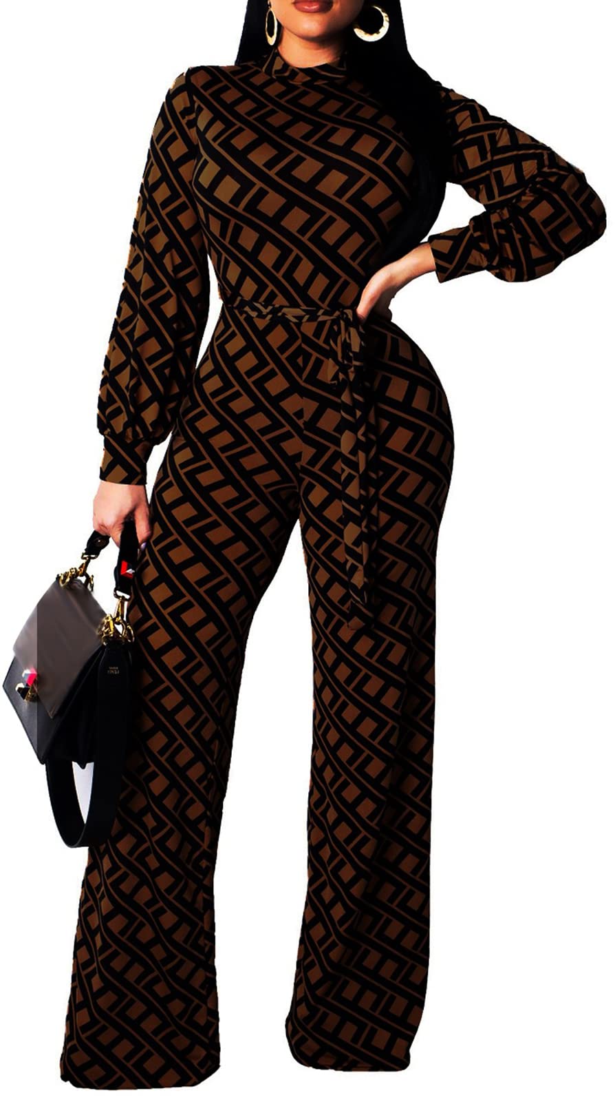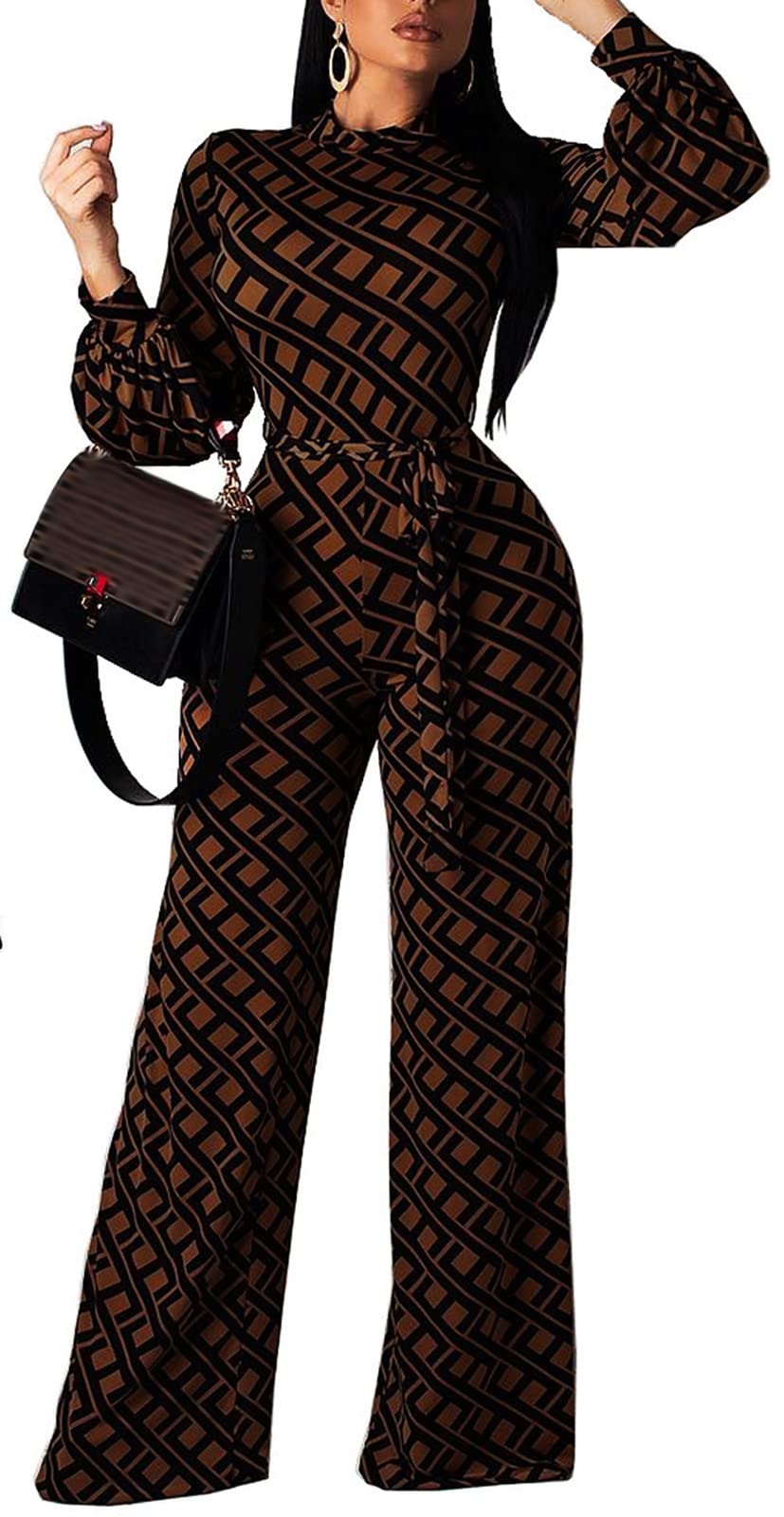 Women Sexy Jumpsuits Casual Turtleneck Long Sleeve Stripes Stretchable Bandage Wide Leg Long Pants Rompers Party Club Brown