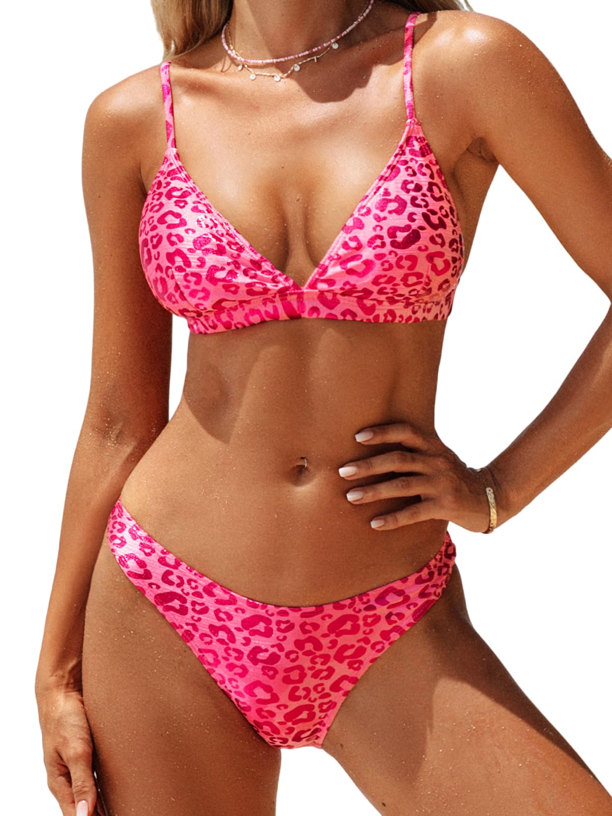 CUPSHE Women's Bikini Sets Swimsuit Triangle Top V Neck Adjustable Straps Low Rise Back Hook Shining High Cut Cheeky Bottom,XL Hot Pink