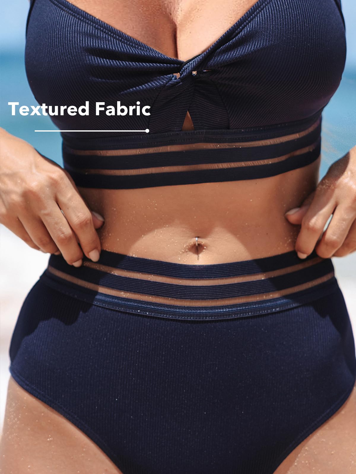 • Design: The Front Twisted Bikini Top Features V Neck and Cutout Design. The Crisscross Straps are Wide and Adjustable. High Waisted Bottom with Mesh Striped Seams, is Very Sexy and Comfortable. Ribbed Texture is More Comfortable.