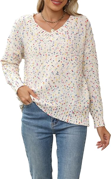 Cakulo Womens 2024 Fall Sweaters V Neck Colorful Chunky Long Sleeve Knit Pullover Sweater Tops