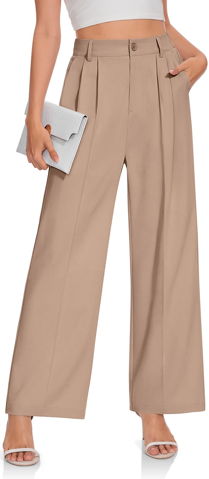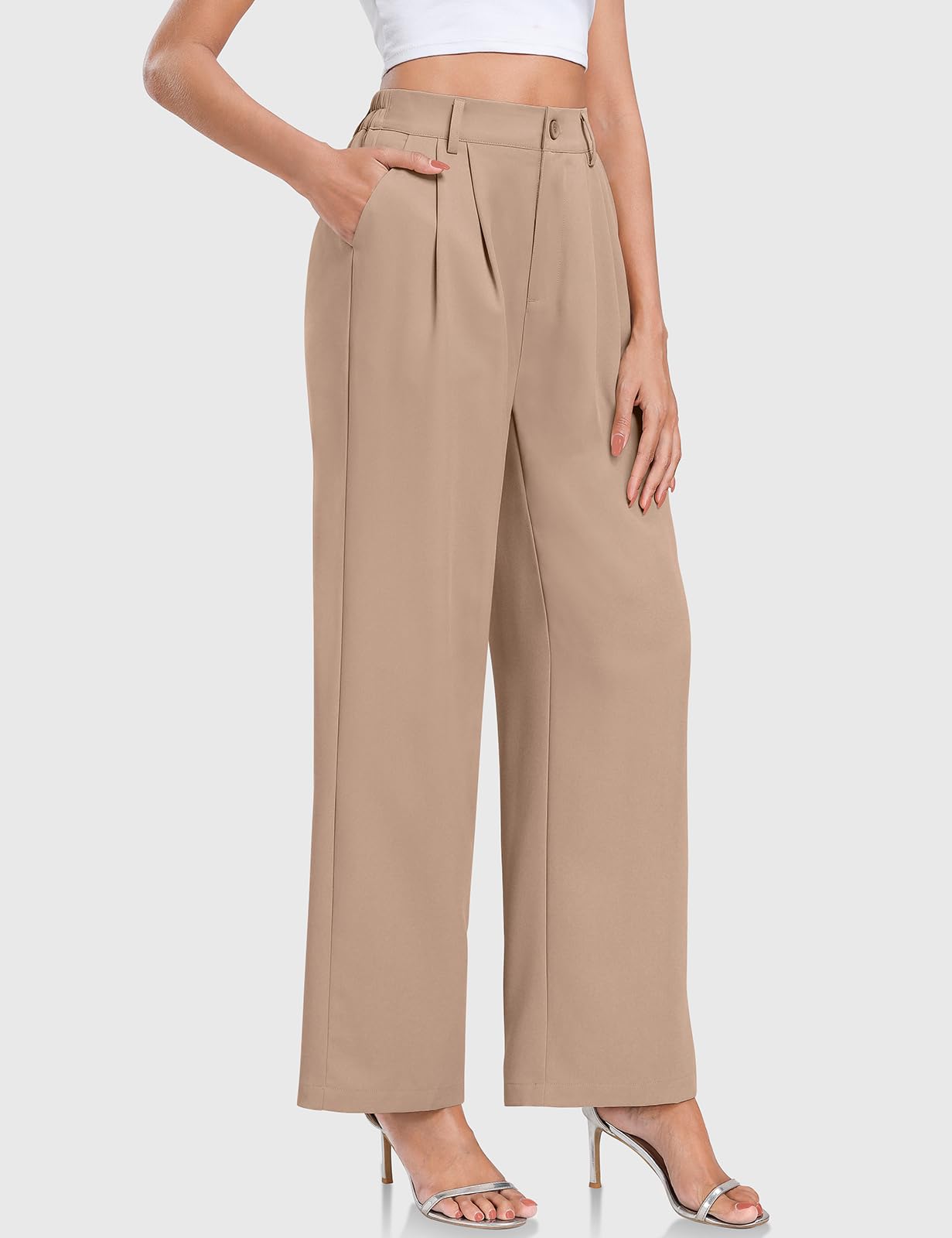TARSE Women's Wear to Work Pants Wide Leg Dress Pants Business Casual Trousers High Waisted Palazzo Pants with Pockets Light Coffee S