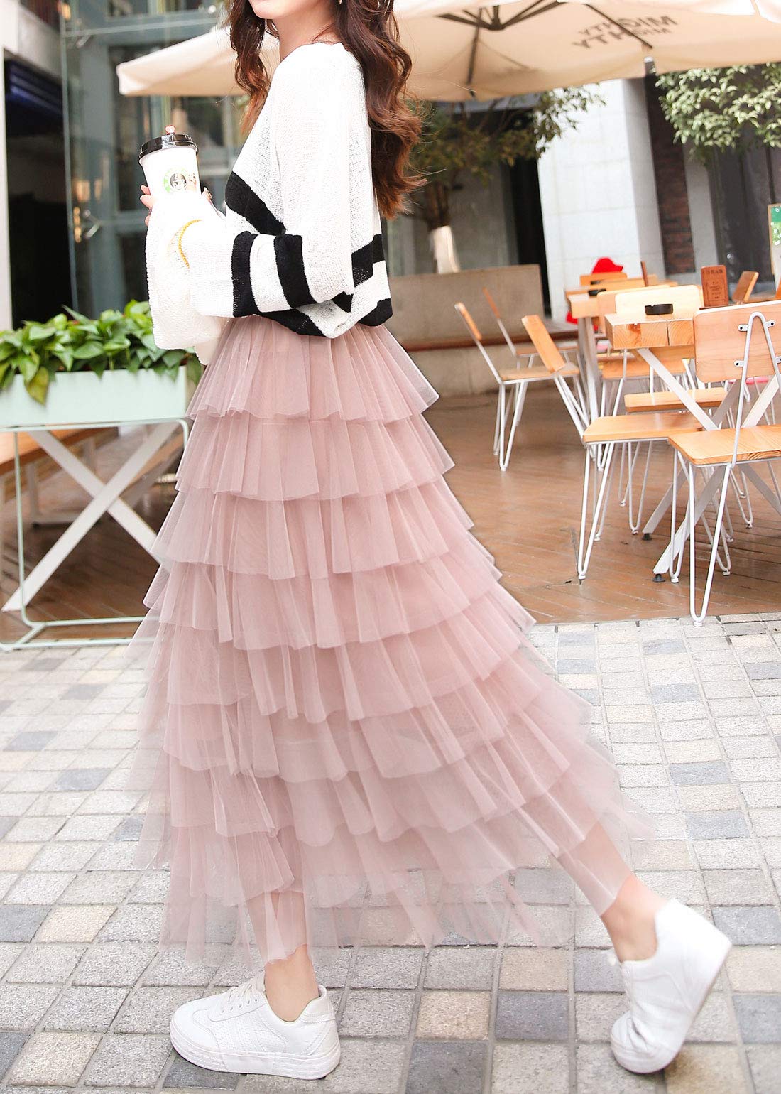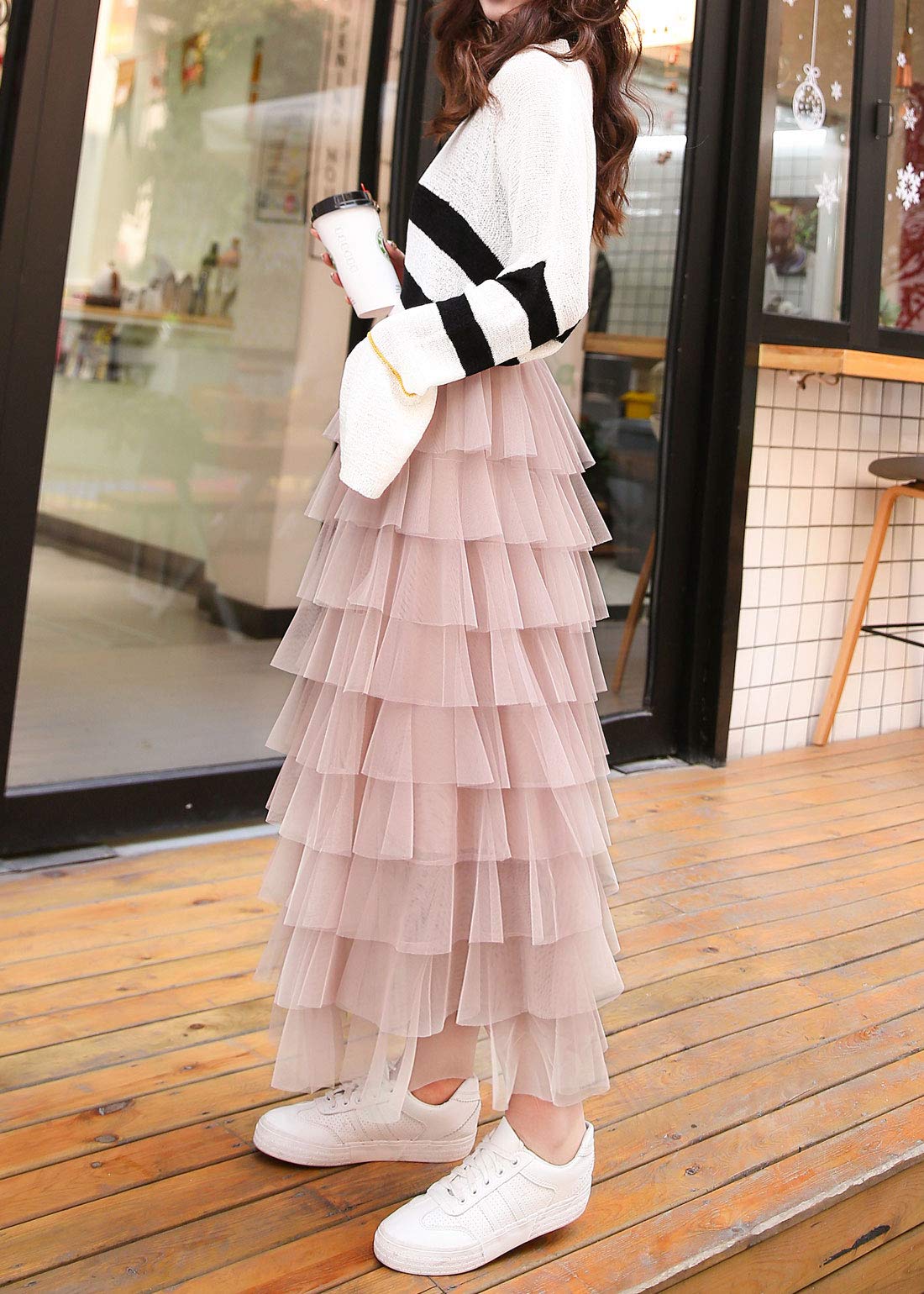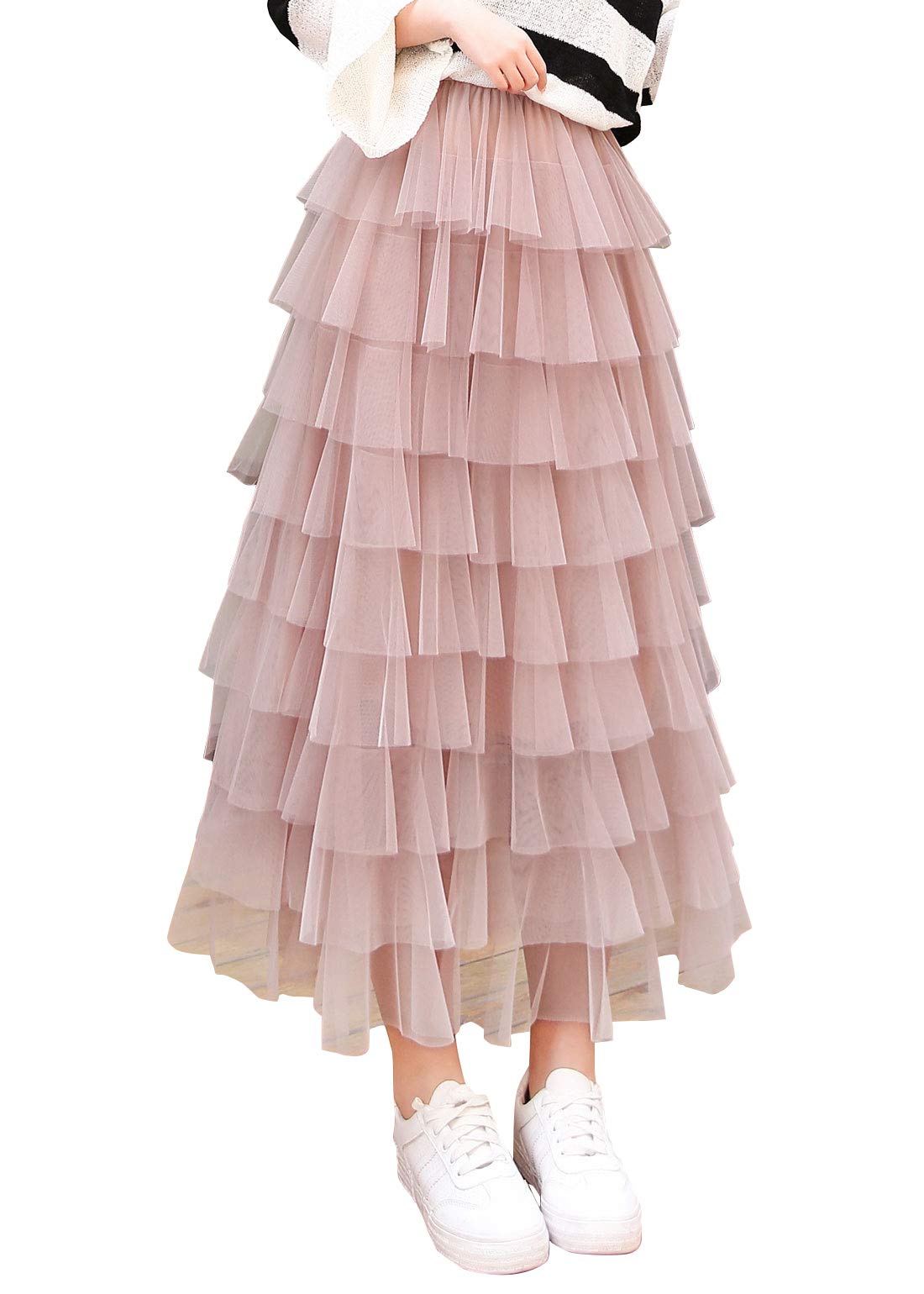 ebossy Women's Sweet Elastic Waist Tulle Layered Ruffles Mesh Long Tiered Skirt (X-Large, Pink)