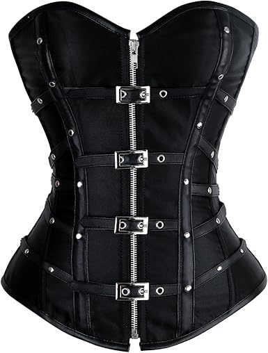 Charmian Women's Gothic Punk Satin Boned Zipper Overbust Corset Top with Buckles