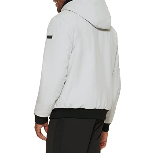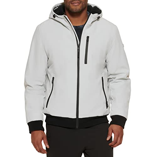 Details: FUNCTIONALITY: Center front zipper closure, two lower welt zipper pockets, one chest zipper pocket, attached hood with draw cord. STYLISH FEATURES: DKNY logo on wearer's left sleeve, bunny sherpa interior body and hood lining, DKNY logo on zipper pulls. Breathable and water resistant softshell