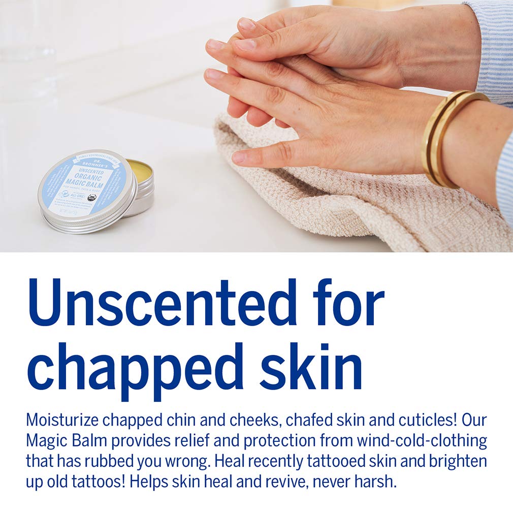 • DR. BRONNER’S ORGANIC MAGIC BALM IS VERSATILE: Our balm is a multifunctional product—like most of our products! It can be used to heal dry hands, face, body, cuticles, chins & cheeks. Apply to chafed skin where needed & get relief.