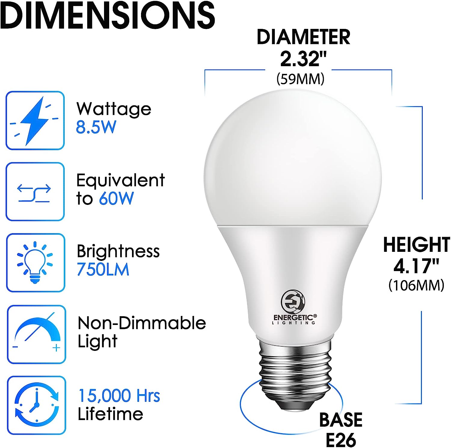 Energetic 24 Pack LED Light Bulbs 60 Watt Equivalent, A19 Warm White 3000K, E26 Base, Non-Dimmable, 750lm, UL Listed