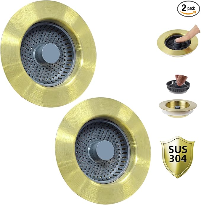 Hibbent 2 Pack Upgraded 3 in 1 Kitchen Sink Drain Strainer and Stopper Combo, Stainless Steel Metal Pop Up Sink Stopper, Anti-Clogging Basket Strainer for US Standard 3-1/2 Inch Drain, Brushed Gold