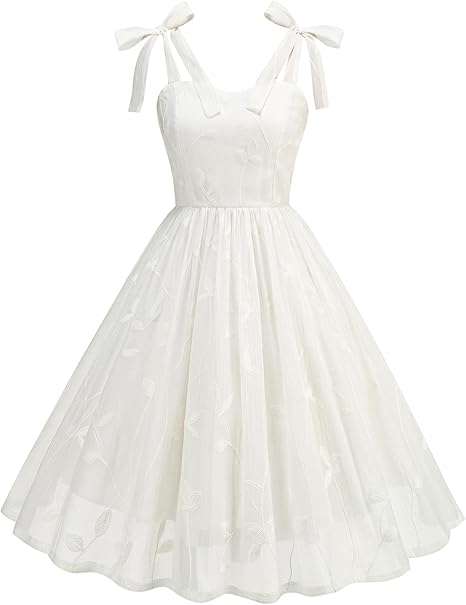 IDOPIP Women Vintage Bowknot Swing Dress Elegant Leaf Embroidery Mesh Dress 1950s Retro Cocktail Prom Gown Formal Midi Dress