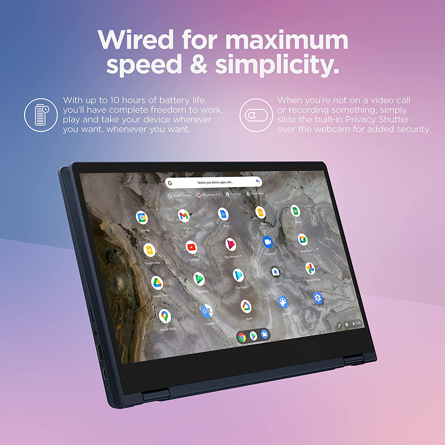The Lenovo™ IdeaPad™ Flex 5 Chromebook 13", powered by 11th Generation Intel® Core™ i3 processor, boasts up to 10 hours of battery life to let you get things done quickly and easily with all your favorite Chromebook features. Use your Google Account for seamless access to your files, photos, music and you can start an immersive entertainment experience with the user-facing stereo speakers and IPS FHD touch display–or you can enjoy more by apps downloaded on the Google Play Store.