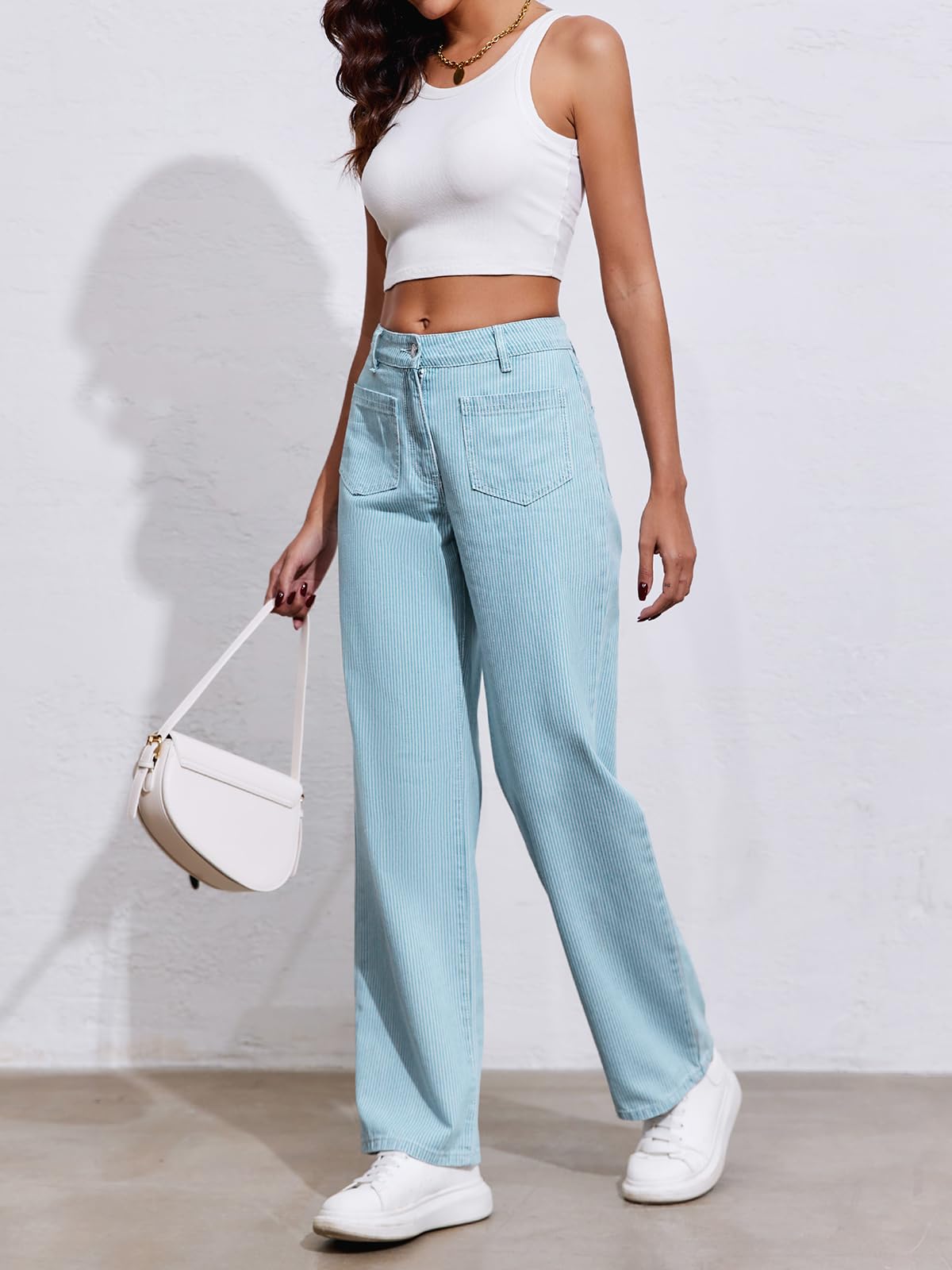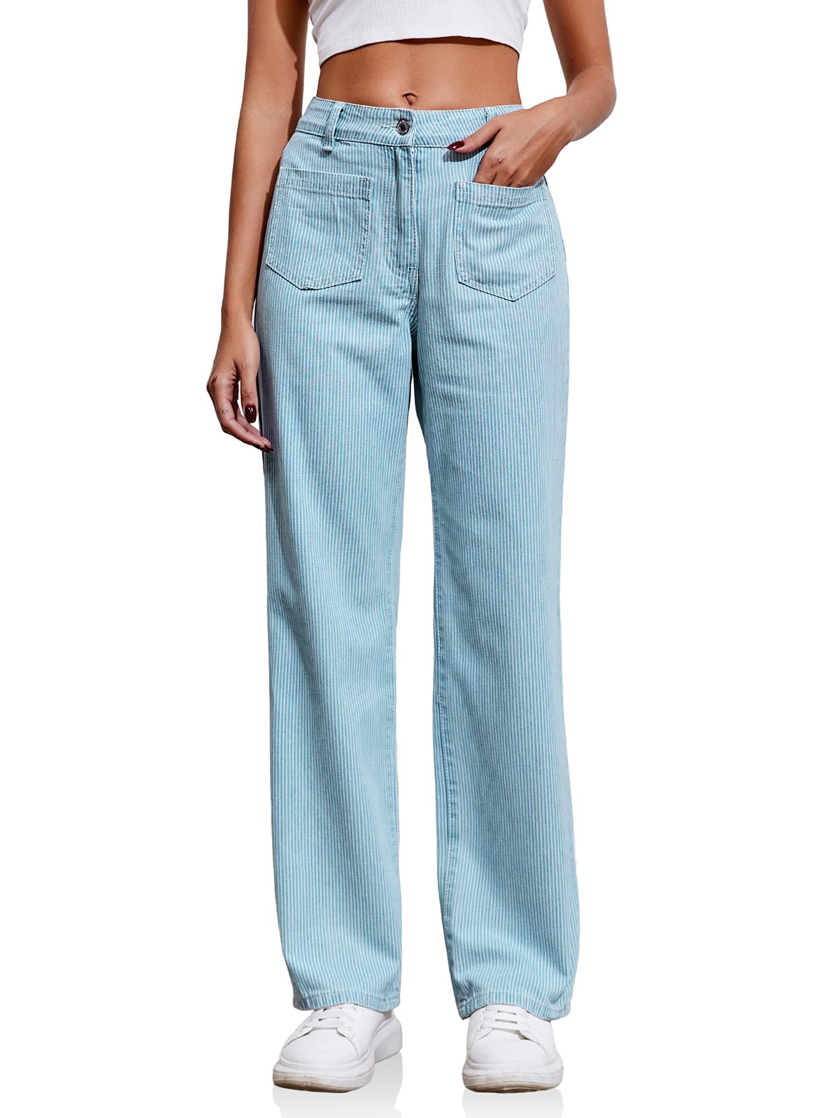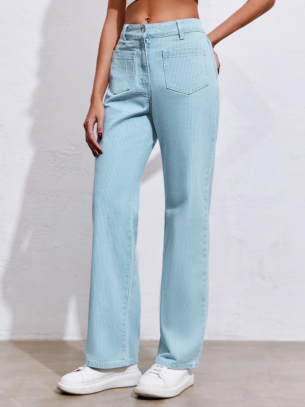 PLNOTME Womens High Waisted Striped Jeans Casual Straight Leg Denim Pants with Pockets Light Blue