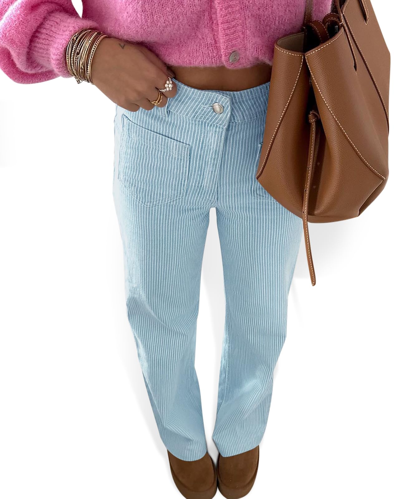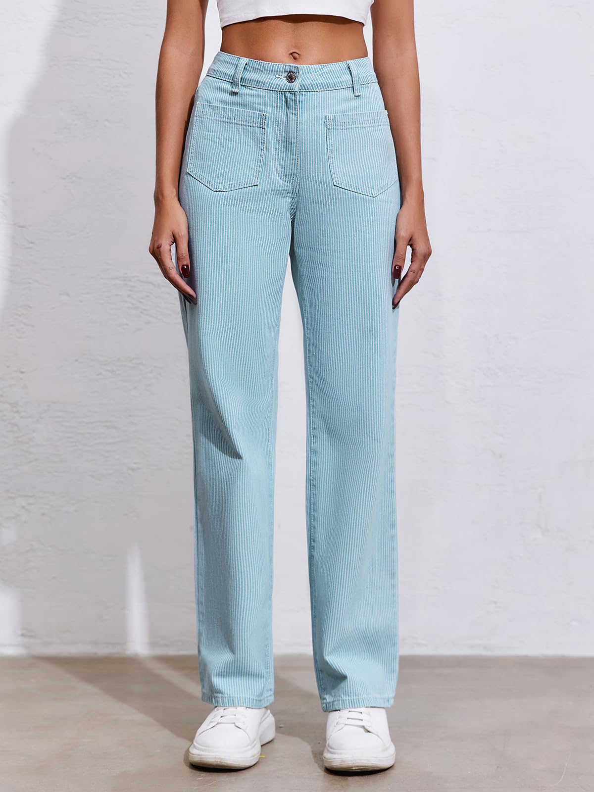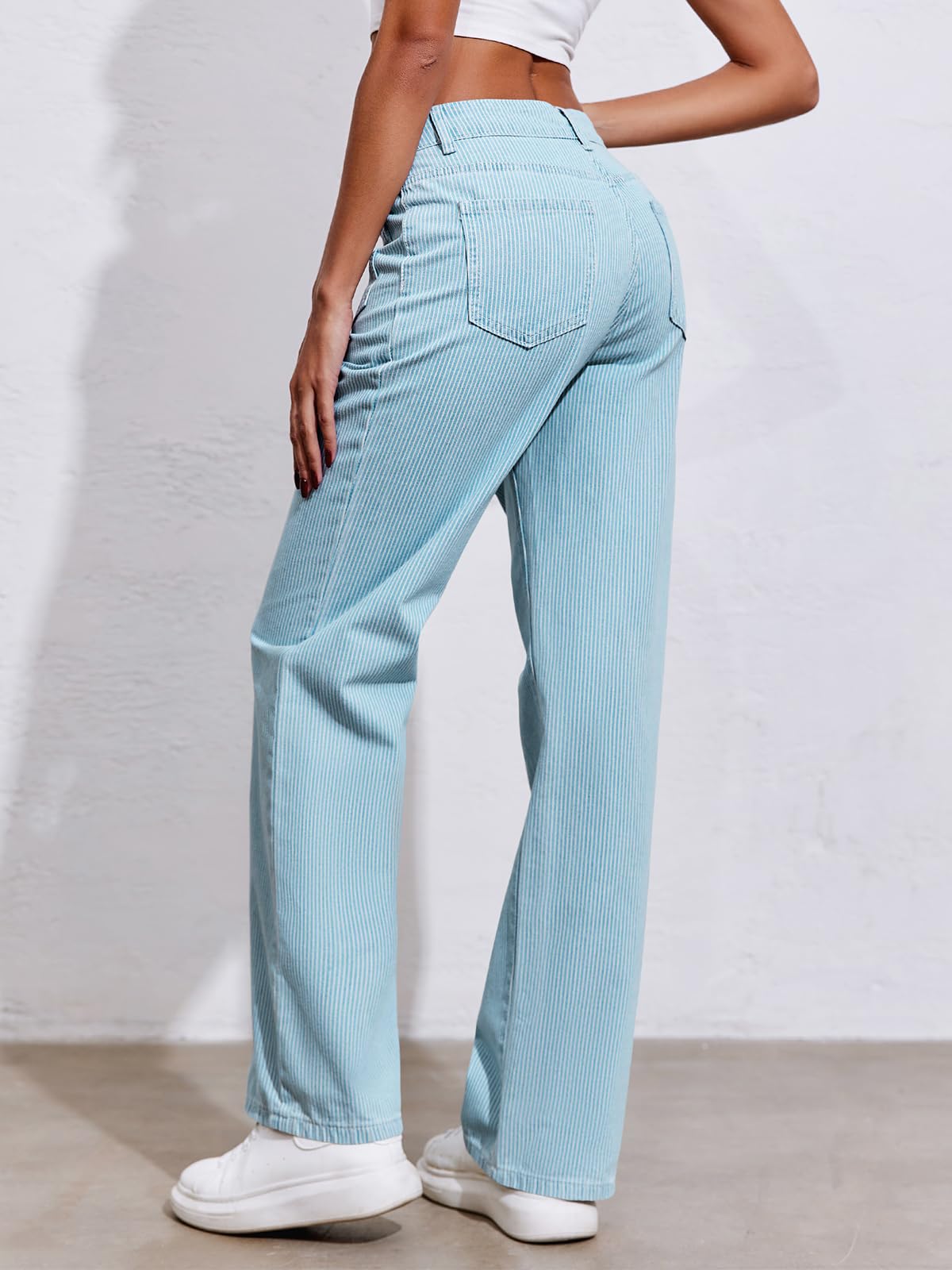 PLNOTME Womens High Waisted Striped Jeans Casual Straight Leg Denim Pants with Pockets Light Blue