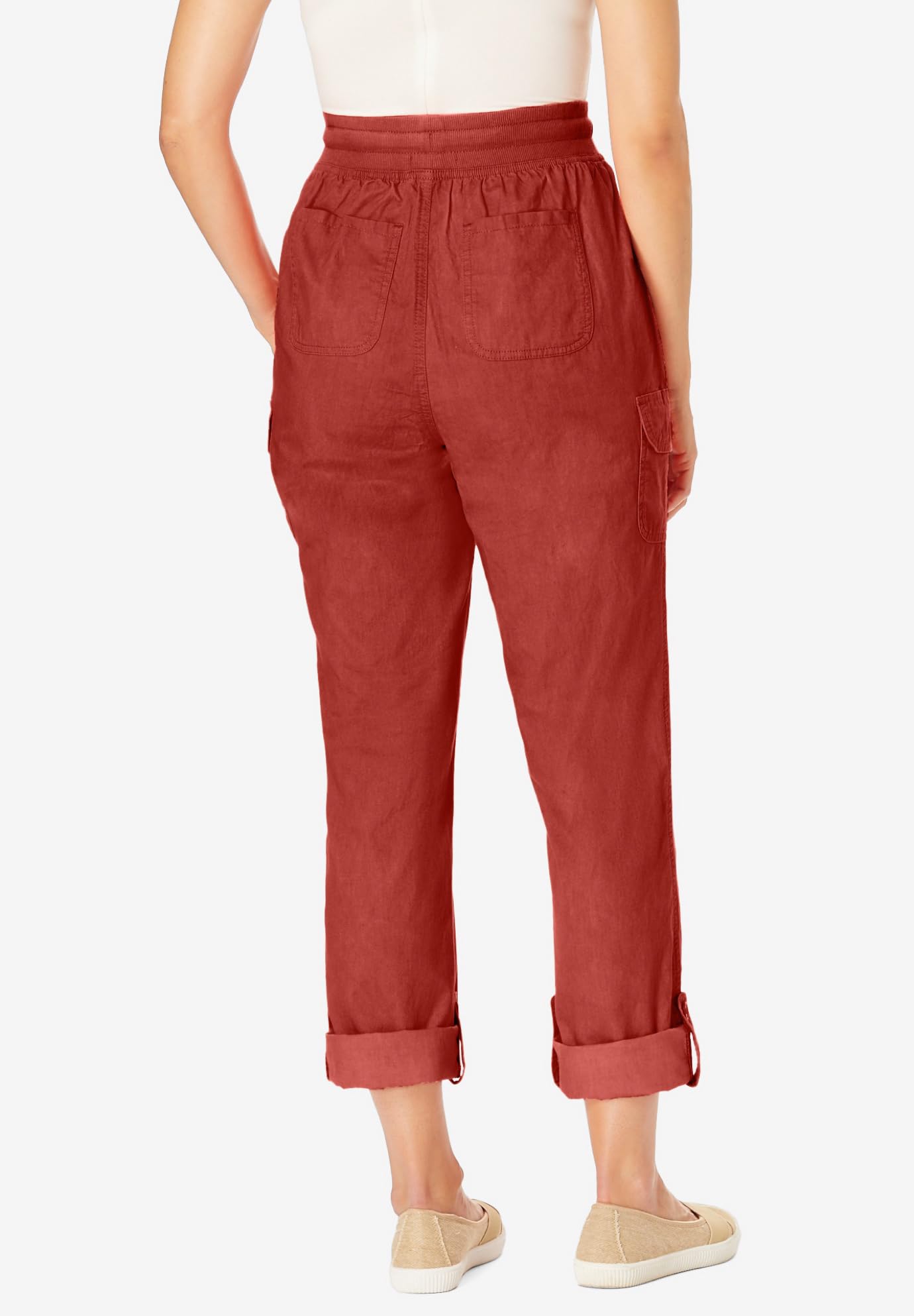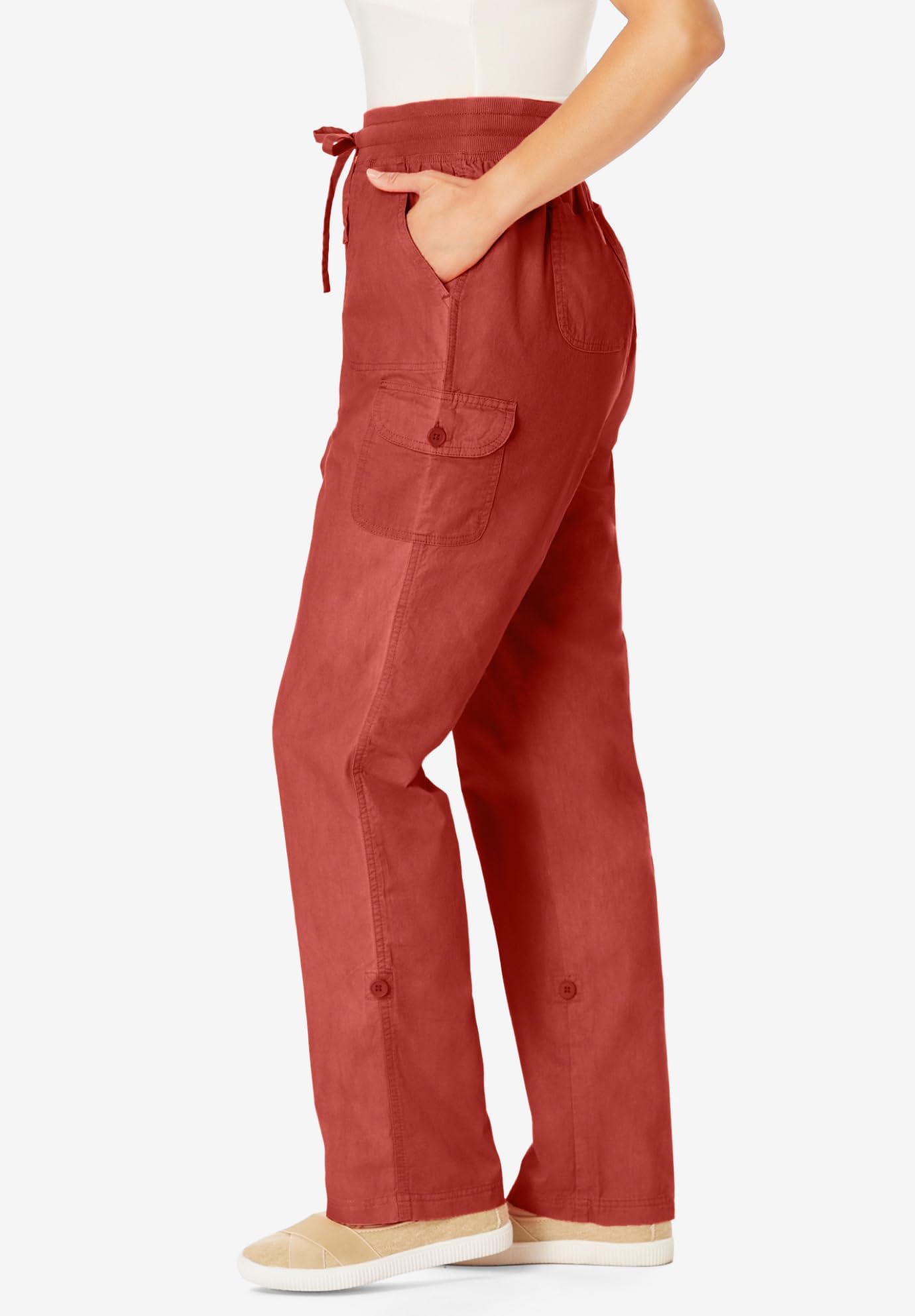 Details: These versatile and lightweight cargo utility pants with straight legs can be worn long or rolled into a capri — it's like getting two pants for the price of one. Button tabs at the hem secure the rolled hem, and small cargo pockets on the sides along with back patch pockets and topstitched slant pockets add to the utility feel. An elastic waistband with adjustable drawstring ensures the perfect fit that you can move in comfortably all day. Regular: 30" pant inseam converts to 23" capris Petite: 28" pant inseam converts to 21" capris 100% Cotton, imported Machine washable