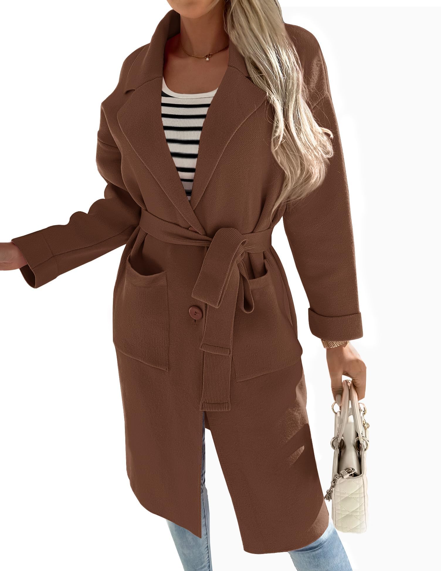 ZESICA Women's 2024 Fall Winter Long Sleeve Open Front Knit Cardigan Lapel Button Down Belted Sweater Coat with Pockets,Brown,Medium