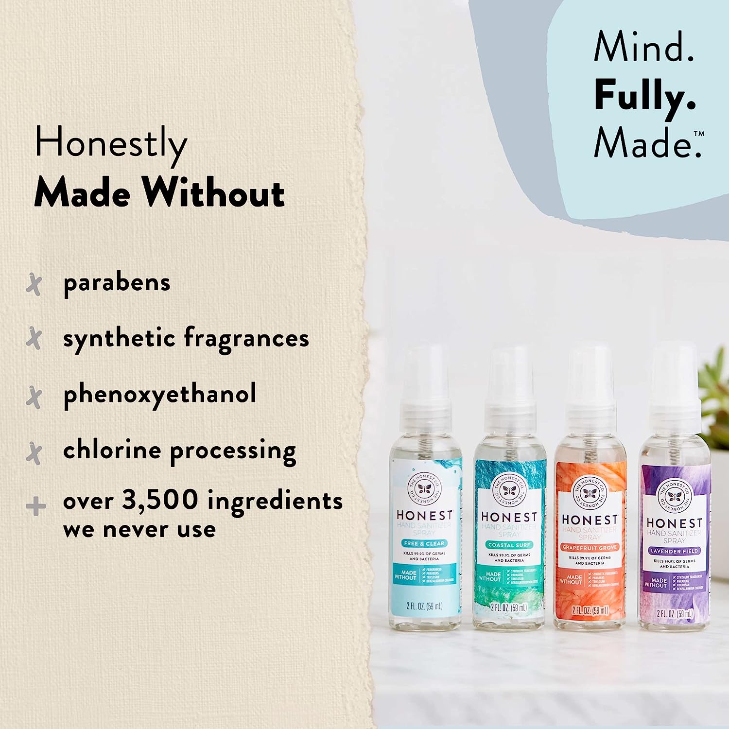This convenient 4-pack includes two sprayers and two refills of our quick-drying, on-the-go hand sanitizer spray. Kills 99.9% of germs + bacteria--without the sticky residue! Hypoallergenic and dermatologist-tested, our Honest formula is made with aloe to help keep the whole fam’s hands soft, moisturized + clean. Base scent may vary due to the sourcing of ingredients. Active Ingredient: Ethyl Alcohol 62% Inactive Ingredients: Aloe Barbadensis Leaf Juice, Calendula Officinalis Flower Extract, Chamomilla Recutita (Matricaria) Flower Extract, Glycerin, Water How to Use: Spray directly on hand and rub in thoroughly. Recommended for repeated use. Warnings: For external use only. Flammable, keep away from fire, sparks, and sources of ignition. Do not store above 104°F/40°C. When using this product keep out of eyes. In case of contact with eyes, flush thoroughly with water. Avoid contact with broken skin. Stop use and ask a doctor if irritation and redness develop and persist for more than 72 hours. Keep out of reach of children. If swallowed, get medical help or contact a Poison Control Center immediately.