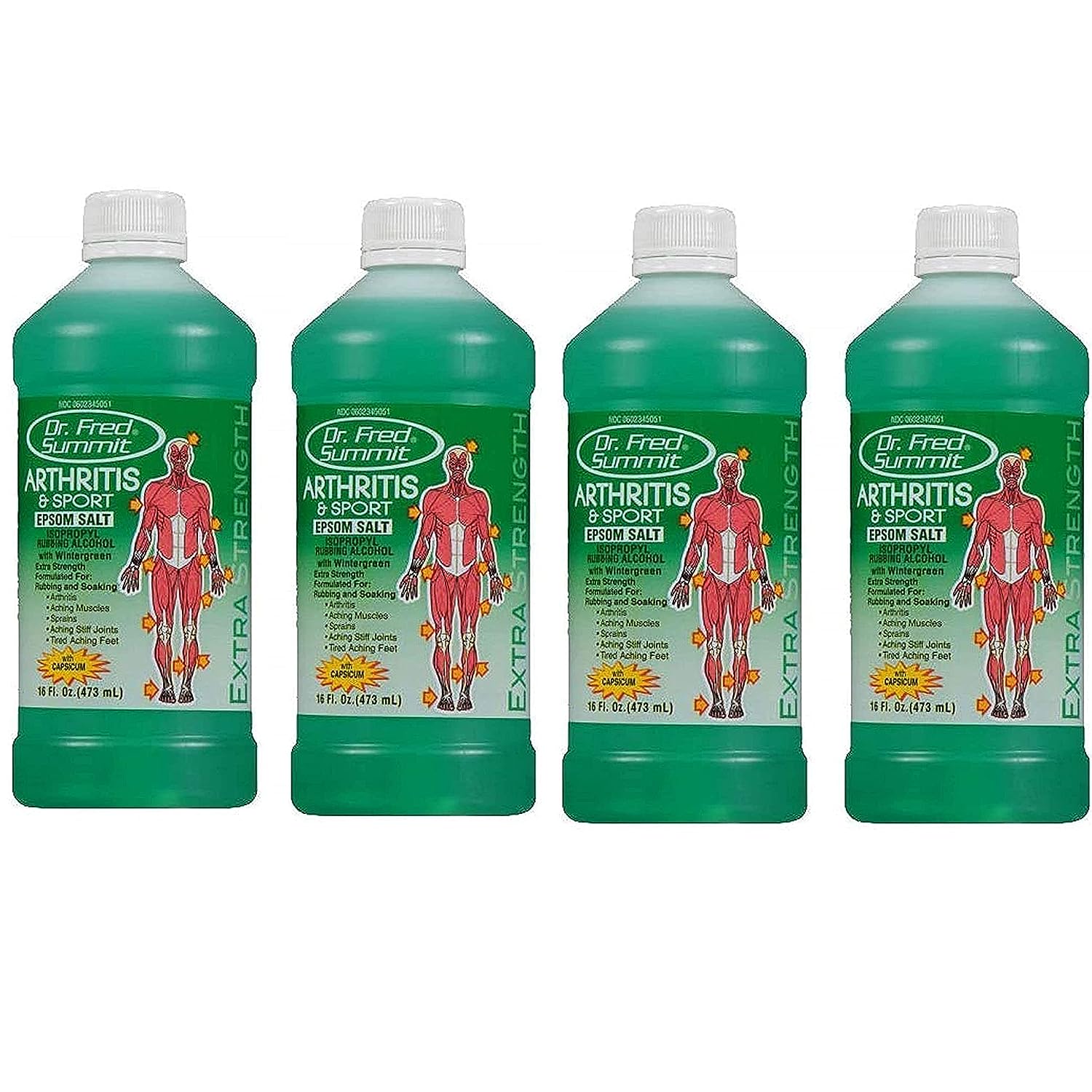Dr. Fred Summit Epsom Salt Rubbing Alcohol helps relieve pain associated with arthritis, aching muscles, sprains, stiff joints and tired feet. It is an extra-strength formula that is ideal for use by all people including athletes. This arthritis and sport alcohol is formulated with capsicum and can be used for rubbing and soaking. Wintergreen adds to the overall positive effects of this magnificent product. For use with massage therapy for relief of muscle aches from overexertion and for the relief of sport related sprains and strains. For use as a soak for the relief of joint stiffness and aching associated with arthritis. Can be used whenever ice packs have been recommended to help reduce pain and swelling and can be used for relieving hot, itchy feet by either massaging on or soaking.