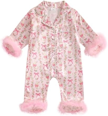 woshilaocai Baby Girl Button Down Romper Bow Strawberry Fuzzy Cuff Long Sleeve Jumpsuit Spring Summer Clothes