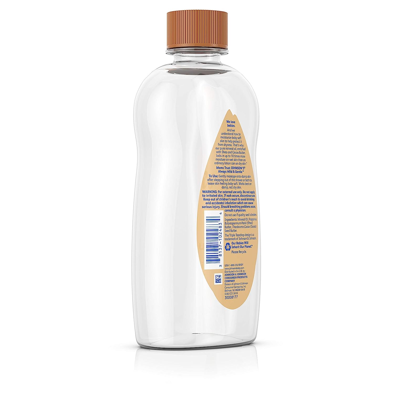 Soothe and moisturize baby soft skin to help protect it from dryness using Johnson's baby oil enriched with shea & cocoa butter. The pure mineral baby oil, enriched with shea and cocoa butter, locks in up to 10 times more moisture *on wet skin than an ordinary lotion can on dry skin. To use, gently massage baby oil onto damp skin after bathing to leave skin feeling baby soft. Works best on damp, not dry skin.