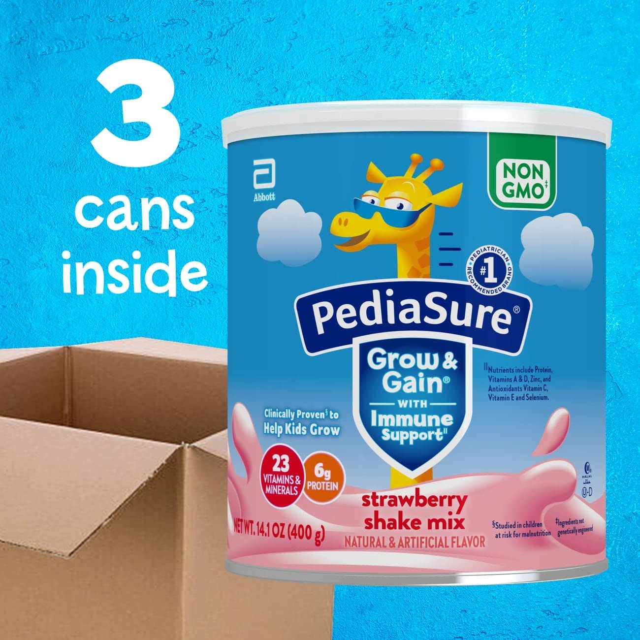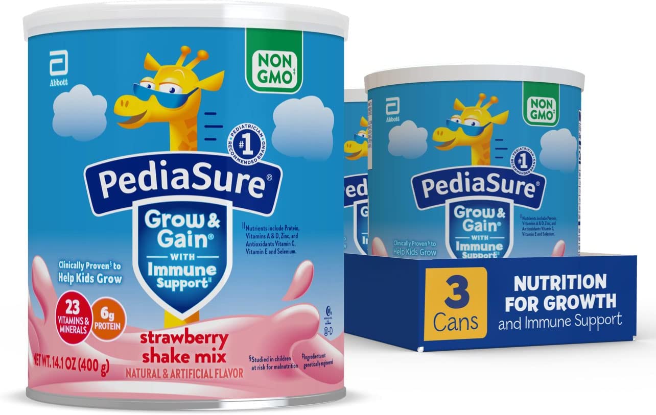 PediaSure Grow & Gain Non-GMO‡ Shake Mix is clinically proven* to help kids grow. We’re the #1 pediatrician recommended brand. Each serving has 6g protein to help build muscles and 23 essential vitamins & minerals. In delicious Vanilla, Chocolate, and Strawberry flavors, our shake mix is gluten-free, kosher, halal, with no artificial growth hormones§; suitable for lactose intolerance|| * Studied in children at risk for malnutrition. † In children ages 3-4 at nutritional risk (5th-25th weight-for-height percentiles), when given 2 servings per day and dietary counseling. ‡ Ingredients not genetically engineered. § No significant difference has been shown between milk derived from rbST-treated and non-rbST-treated cows. || Not for children with galactosemia.