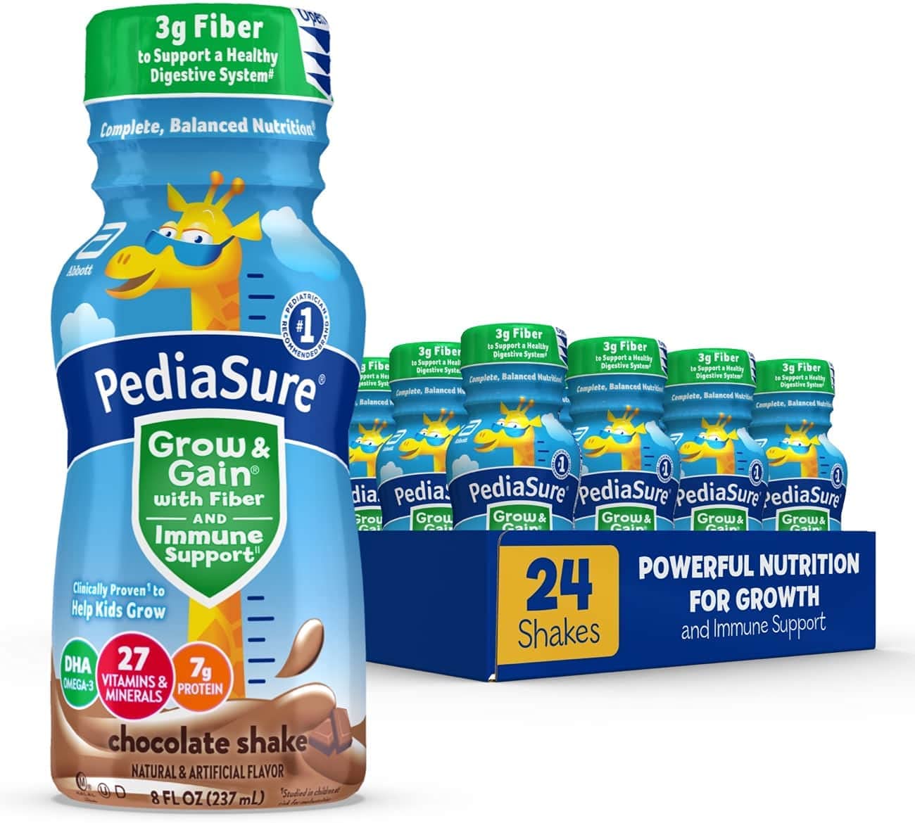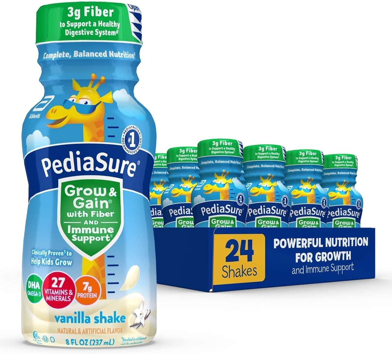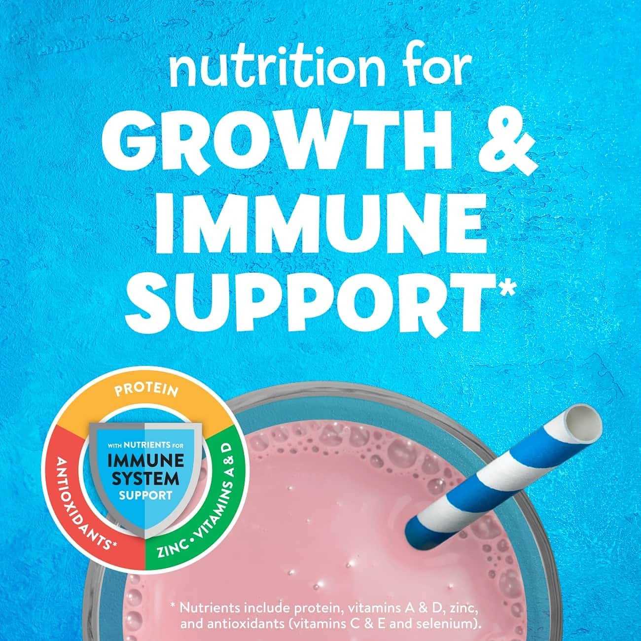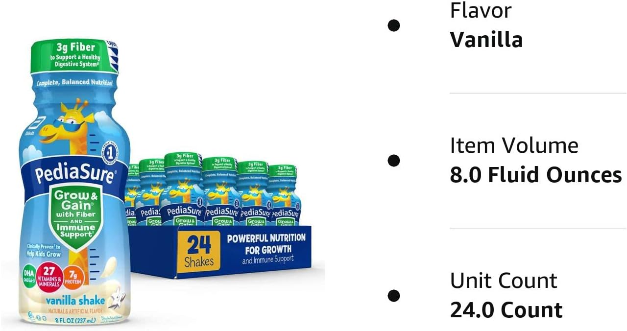 PediaSure Grow & Gain with Fiber and Immune Support* kids nutritional shakes are clinically proven† to help kids grow. Each shake has 3g of fiber‡ to help support a healthy digestive system. Our shakes also have 27 essential vitamins & minerals, 7g of protein, & 32mg of DHA omega-3. It’s great for breakfast, in a lunch box, and as a snack. From the #1 pediatrician recommended brand. Eligible to be purchased with Supplemental Nutrition Assistance Program (SNAP) benefits in select stores. Not for children with galactosemia. * Nutrients include protein, vitamins A & D, zinc, and antioxidants (vitamins C & E and selenium). † Studied in children at risk for malnutrition. ‡ 9g of total fat per serving. § In children ages 3-4 at nutritional risk (5th-25th weight-for-height percentiles), when given 2 servings per day and dietary counseling. ǁIngredients not genetically engineered. ¶ No significant difference has been shown between milk derived from rbST-treated and non-rbST-treated cows.