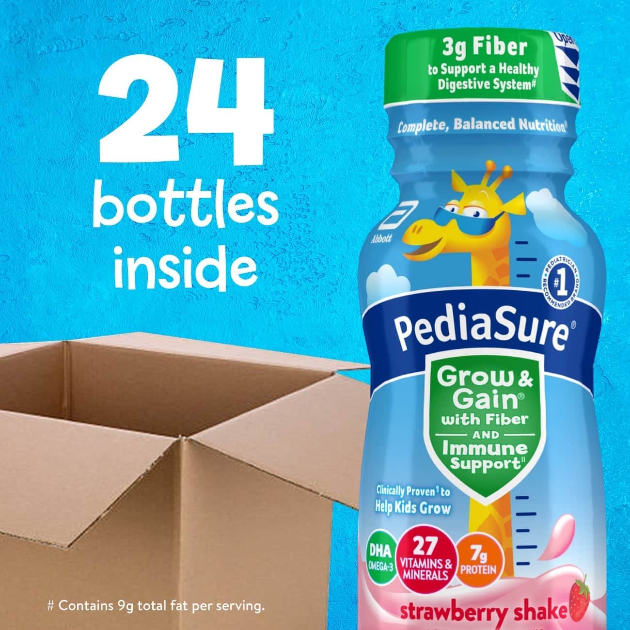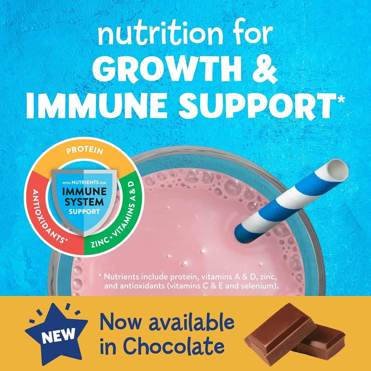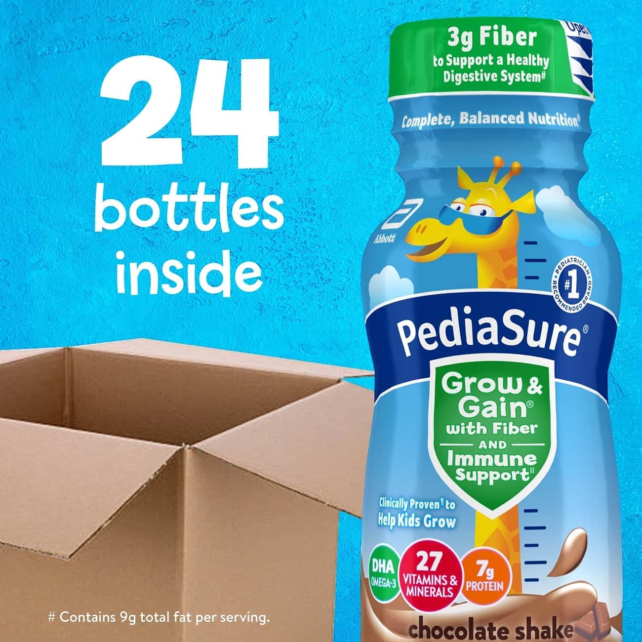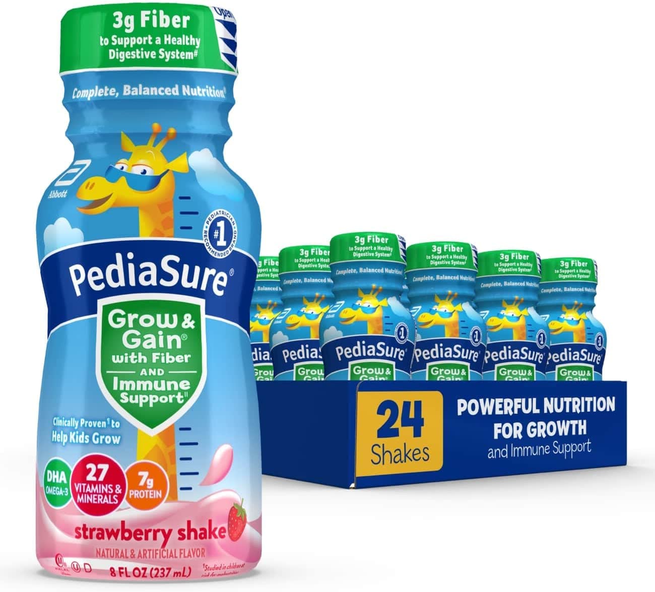 PediaSure Grow & Gain with Fiber and Immune Support* kids nutritional shakes are clinically proven† to help kids grow. Each shake has 3g of fiber‡ to help support a healthy digestive system. Our shakes also have 27 essential vitamins & minerals, 7g of protein, & 32mg of DHA omega-3. It’s great for breakfast, in a lunch box, and as a snack. From the #1 pediatrician recommended brand. Eligible to be purchased with Supplemental Nutrition Assistance Program (SNAP) benefits in select stores. Not for children with galactosemia. * Nutrients include protein, vitamins A & D, zinc, and antioxidants (vitamins C & E and selenium). † Studied in children at risk for malnutrition. ‡ 9g of total fat per serving. § In children ages 3-4 at nutritional risk (5th-25th weight-for-height percentiles), when given 2 servings per day and dietary counseling. ǁIngredients not genetically engineered. ¶ No significant difference has been shown between milk derived from rbST-treated and non-rbST-treated cows.