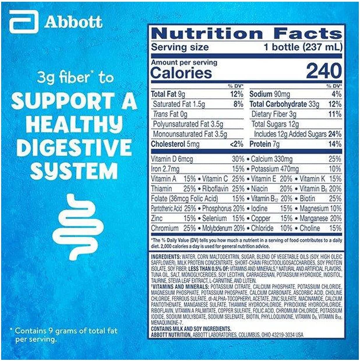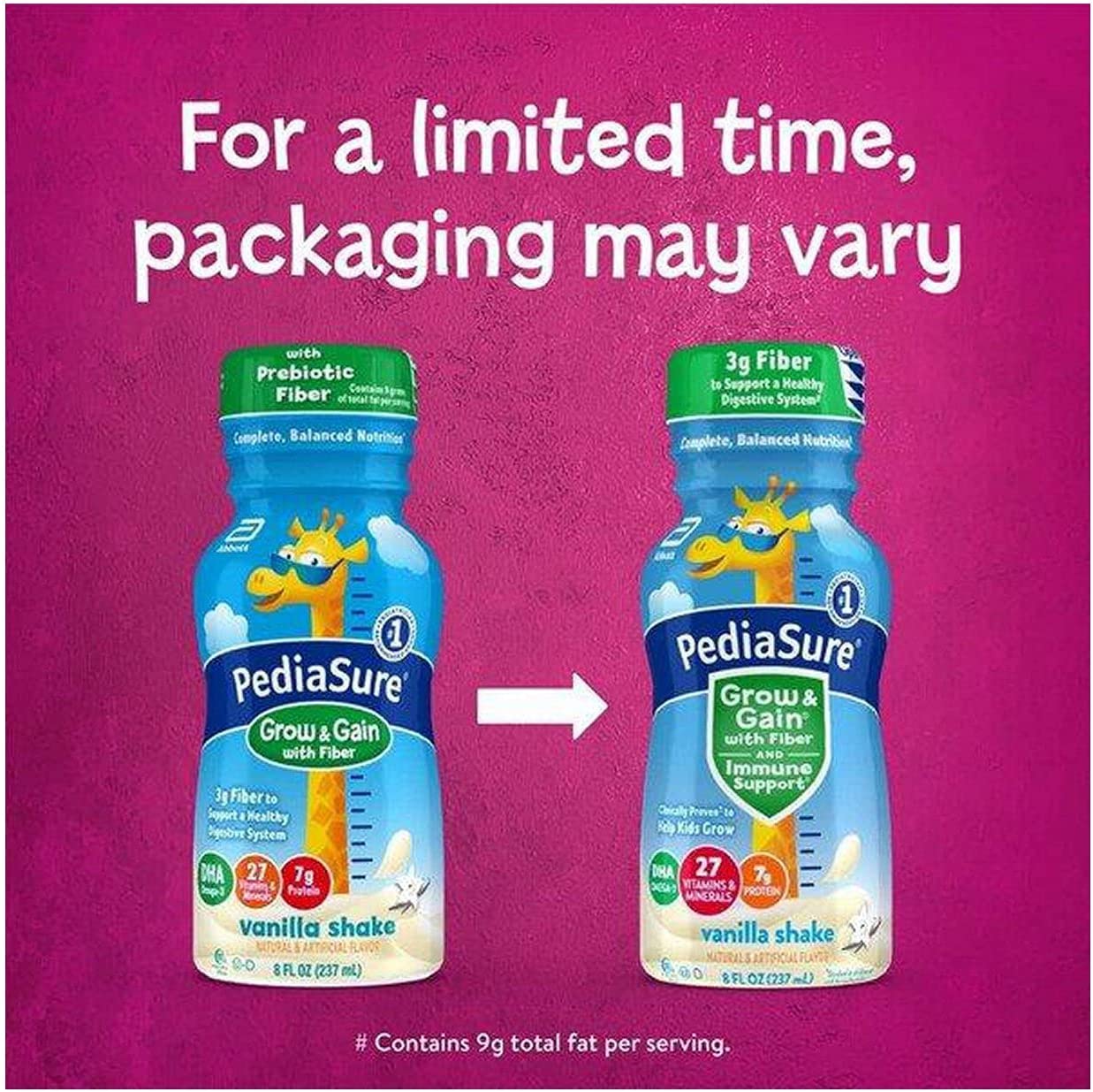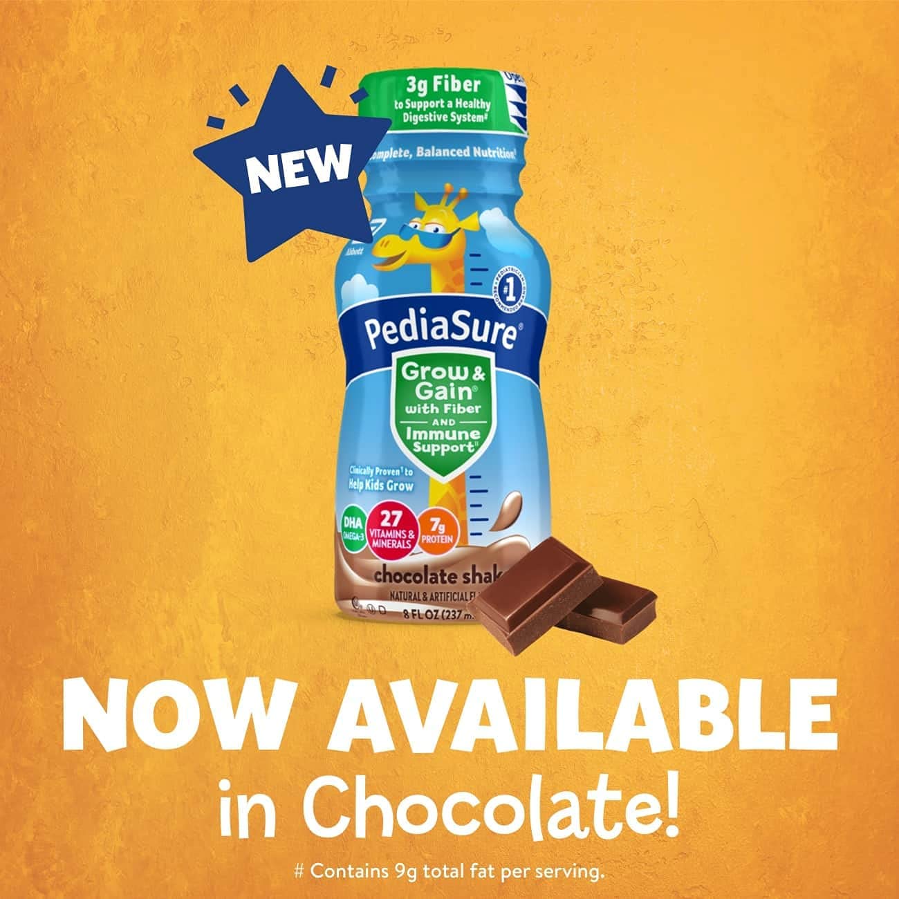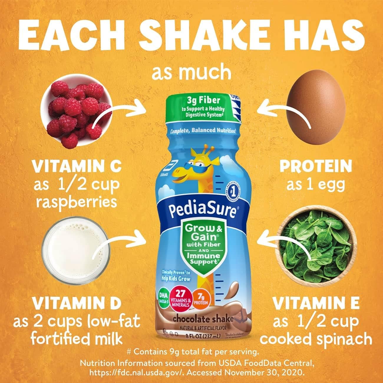 PediaSure Grow & Gain with Fiber and Immune Support* kids nutritional shakes are clinically proven† to help kids grow. Each shake has 3g of fiber‡ to help support a healthy digestive system. Our shakes also have 27 essential vitamins & minerals, 7g of protein, & 32mg of DHA omega-3. It’s great for breakfast, in a lunch box, and as a snack. From the #1 pediatrician recommended brand. Eligible to be purchased with Supplemental Nutrition Assistance Program (SNAP) benefits in select stores. Not for children with galactosemia. * Nutrients include protein, vitamins A & D, zinc, and antioxidants (vitamins C & E and selenium). † Studied in children at risk for malnutrition. ‡ 9g of total fat per serving. § In children ages 3-4 at nutritional risk (5th-25th weight-for-height percentiles), when given 2 servings per day and dietary counseling. ǁIngredients not genetically engineered. ¶ No significant difference has been shown between milk derived from rbST-treated and non-rbST-treated cows.