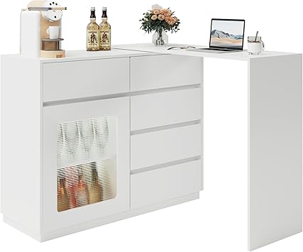 44"-85" LED Wine Bar Cabinet for Liquor & Glasses, Modern Kitchen Cabinet Coffee Bar Table with Drawers & Wine Bottle Rack, Extendable Buffet Kitchen Storage Cabinet for Dinning Room, White