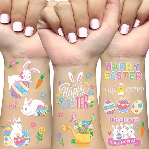 Ovaserva Easter Temporary Tattoos for Kids 62 Glitter Styles, Easter Stickers for Egg Hunt Fillers & Bunny Party Favors, Basket Stuffers, Spring Crafts