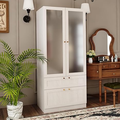 2 Door Wardrobe Armoire Closet with Hanging Rod & 2 Drawers, Bedroom Armoire with Frosted Glass Door, Clothes Wardrobe with Gold Knobs, Wood Grain 19.9Š—�D x 31.5Š—�W x 70.9Š—�H
