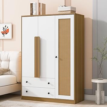 Merax 3-Doors Wooden Rattan Wardrobe Storage Shelves and Hanging Rail for Clothes for Bedroom, with 2 Drawers, White+Nature