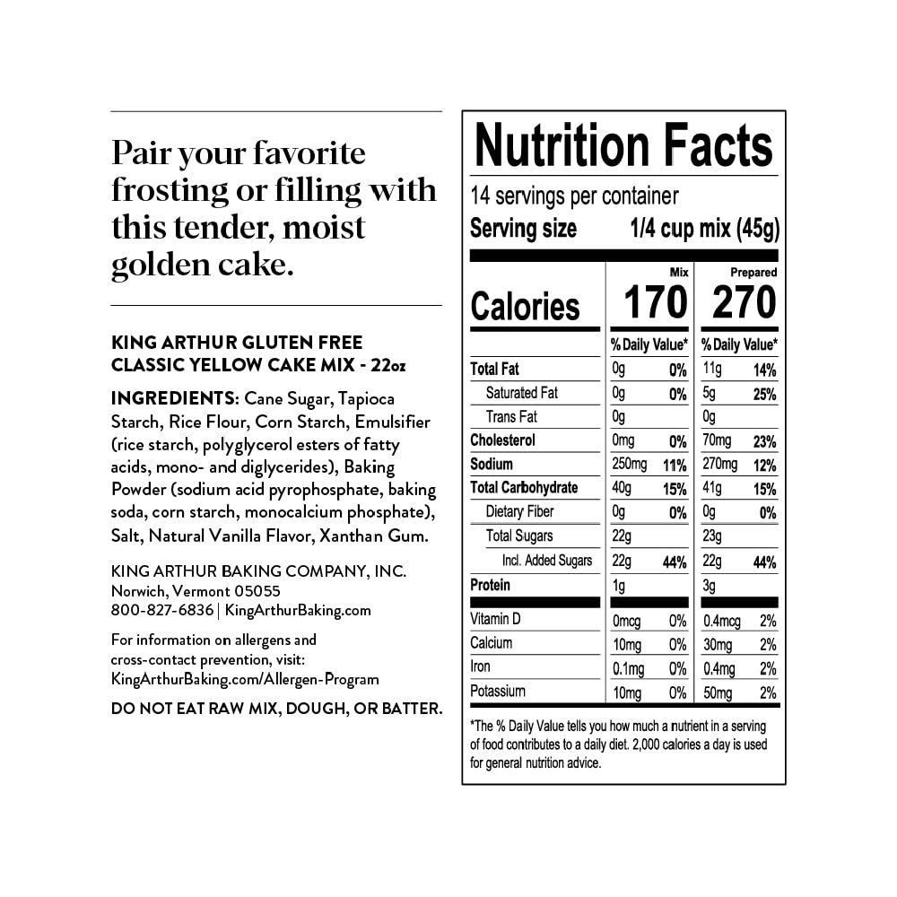 Our motto? Never compromise on cake. So we carefully craft our gluten-free mix to make the best ever yellow cake, every time you bake. Turn it into a tender, golden layer cake or make a batch of moist, finely-crumbed cupcakes. You pick the frostings and fillings (sprinkles are optional, but highly recommended). Makes two 8" or 9" round layers, a 9" x 13" cake, or 24 cupcakes. Certified Gluten-Free by the non-profit Gluten-Free Certification Organization (GFCO), a program of the Gluten Intolerance Group (GIG). Certified kosher. Sourced non-GMO. Fortified with iron, calcium, and vitamin B. Our mixes are carefully crafted in our test kitchen through meticulous taste-testing (it’s a tough job, but we’re up to the challenge!) and blending to replicate our favorite recipes. The result? Wholesome mixes that make the finest gluten-free baked goods around. Simple ingredients, reliable results, and deliciousness for everyone to enjoy! Founded in 1790, King Arthur is a 100% Employee-Owned Company and the nation’s premier baking resource, offering everything from top-quality baking products to inspiring recipes.