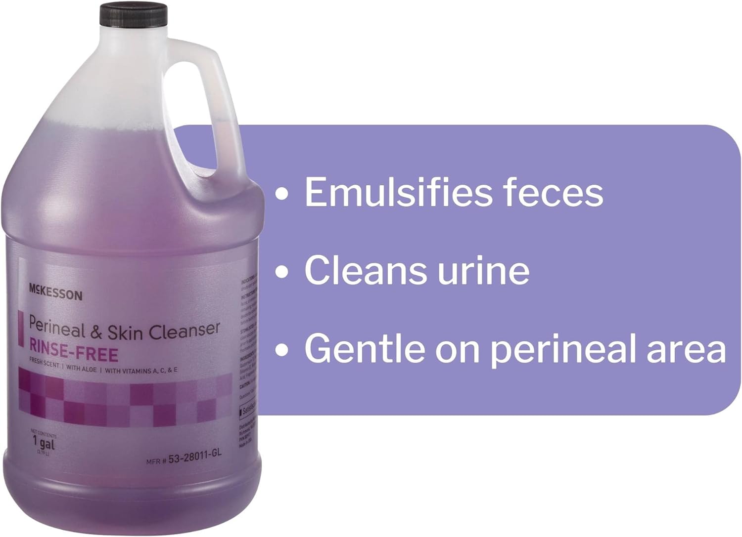 • Rinse-free cleanser: Aids in emulsifying feces and cleansing urine for infirm individuals; intended for use in reducing perineal dermatitis such as skin rashes or bumps