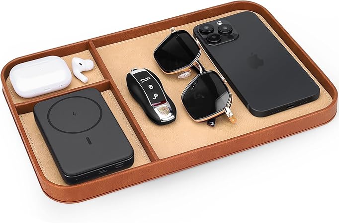 SENEN Leather Tray, Stylish and Organized Multifunctional Tray, for Table Entryway, Premium PU Leather, Catchall Tray for Keys, Watch, Wallet, Jewelry, and More (Brown Frame)