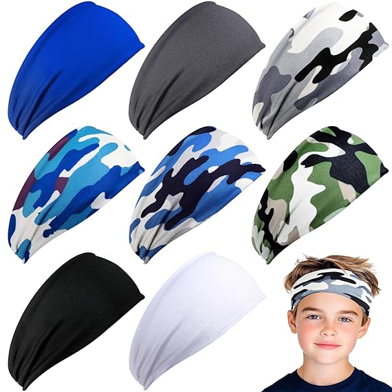 8 PCS Sweatbands for Kids, Non Slip Breathable Sweat Absorbing Headbands for Boys and Girls, Multicolour Elastic Athletic Kids Headbands for Basketball, Football, Baseball, Running, Exercise