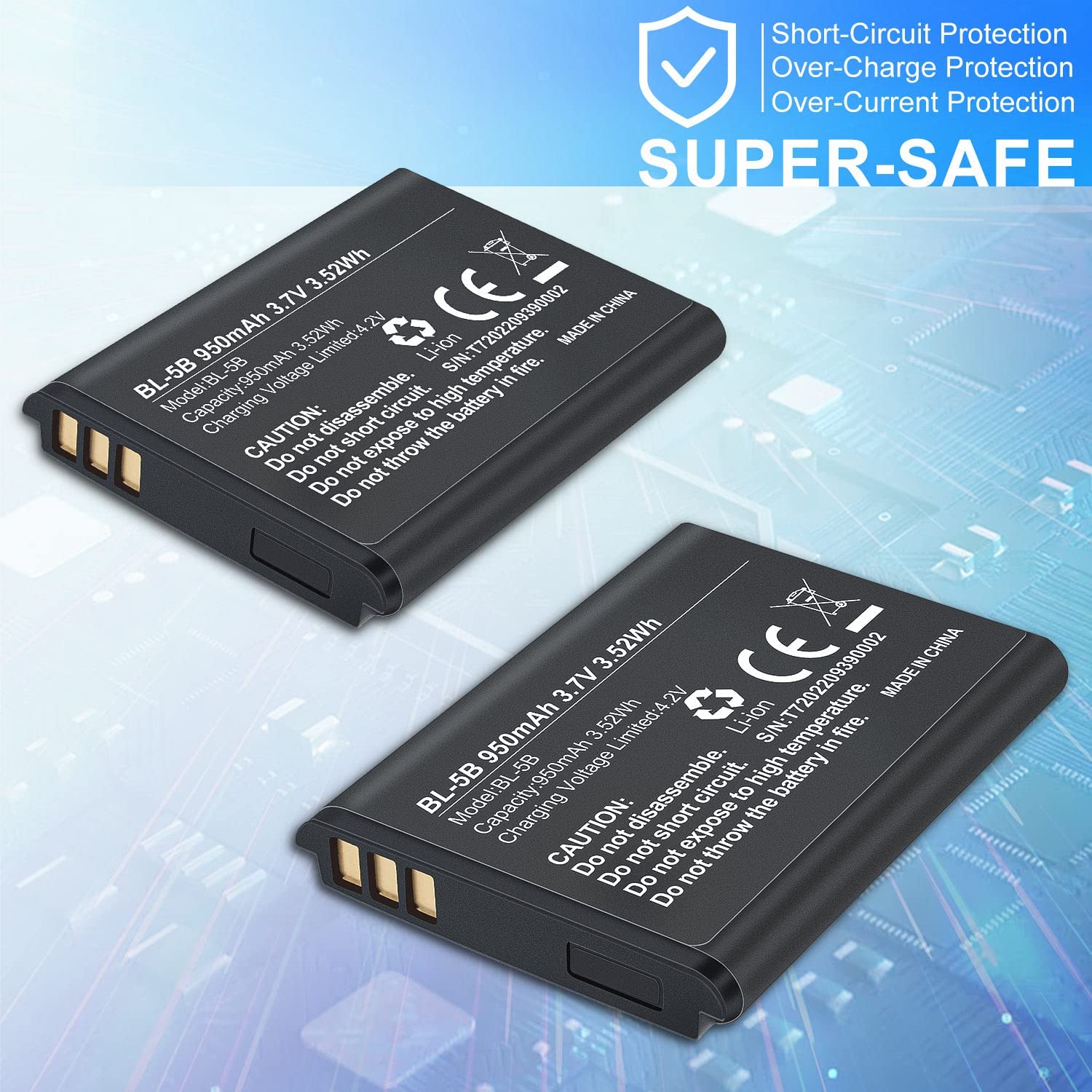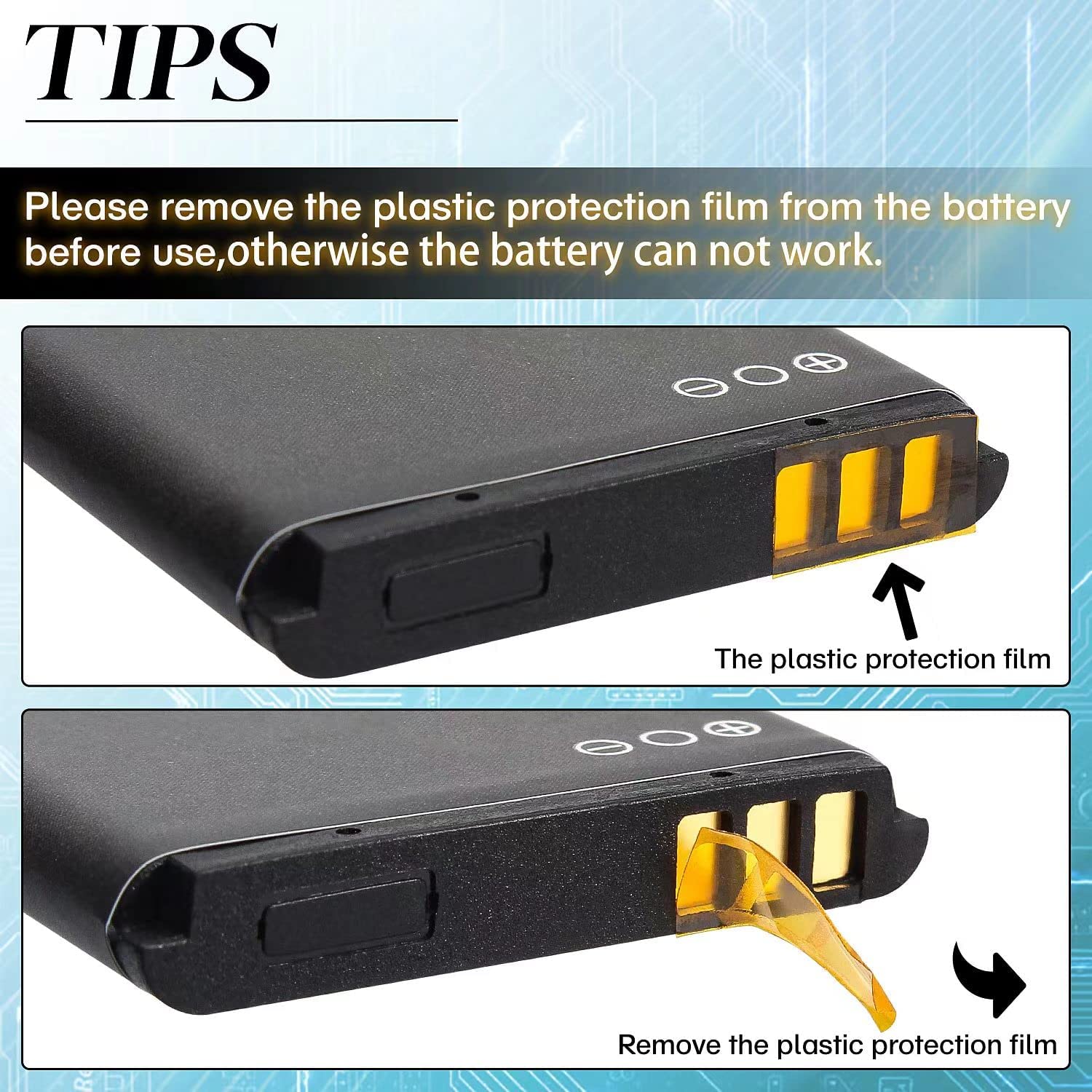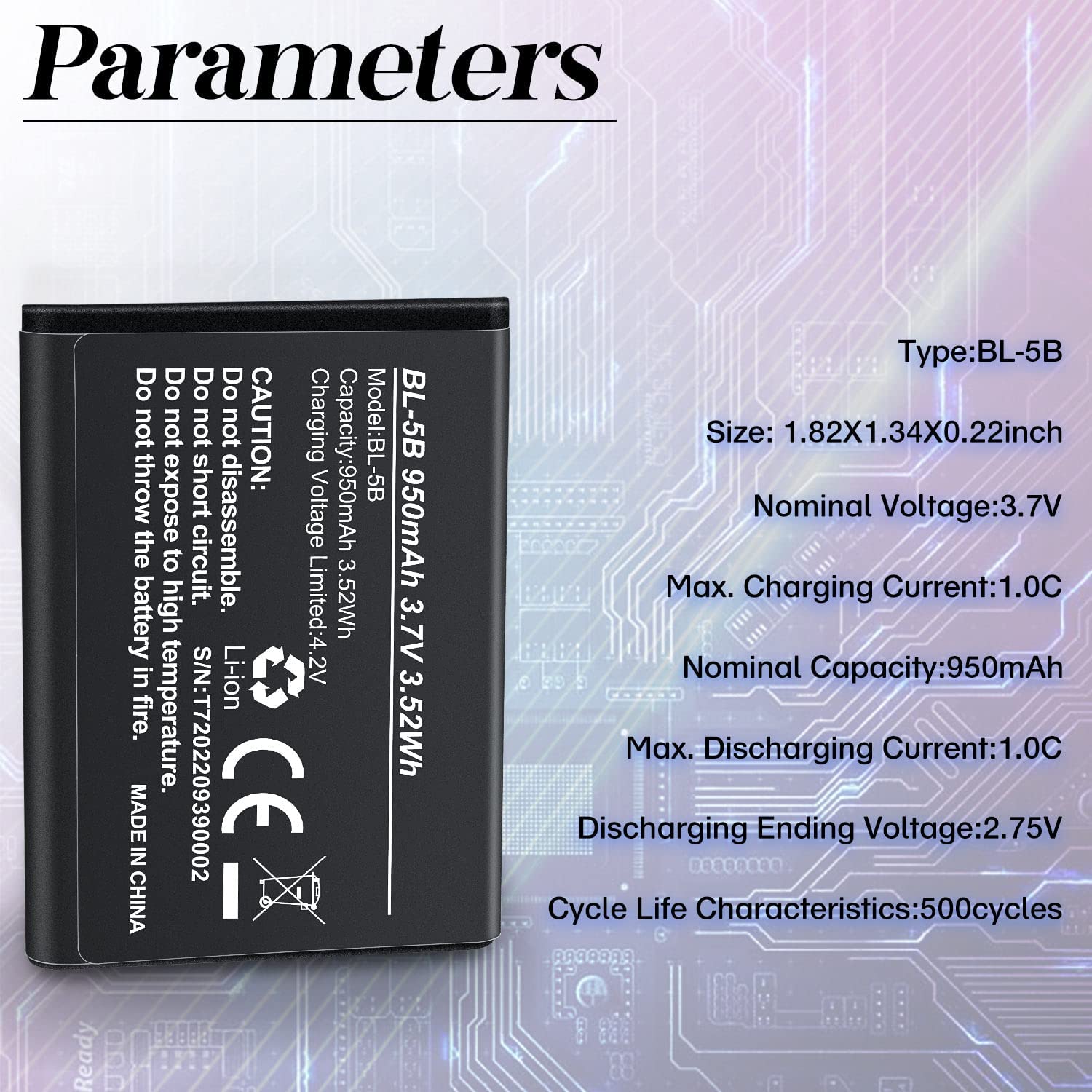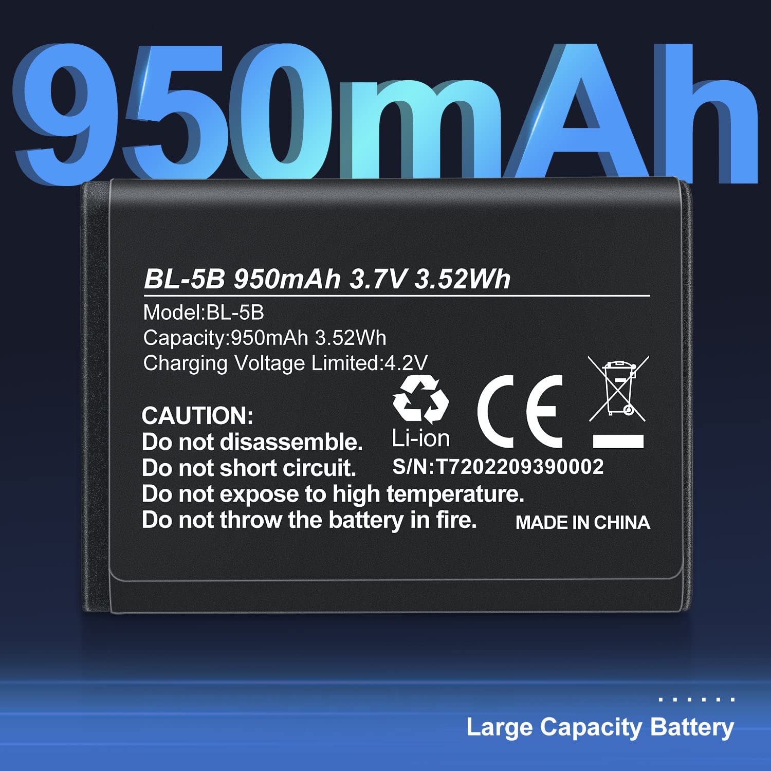 • .Notice: Please tear off the yellow protective film of the power point before use.950mAh, BL-5B, Lithium ion high capacity rechargeable battery.