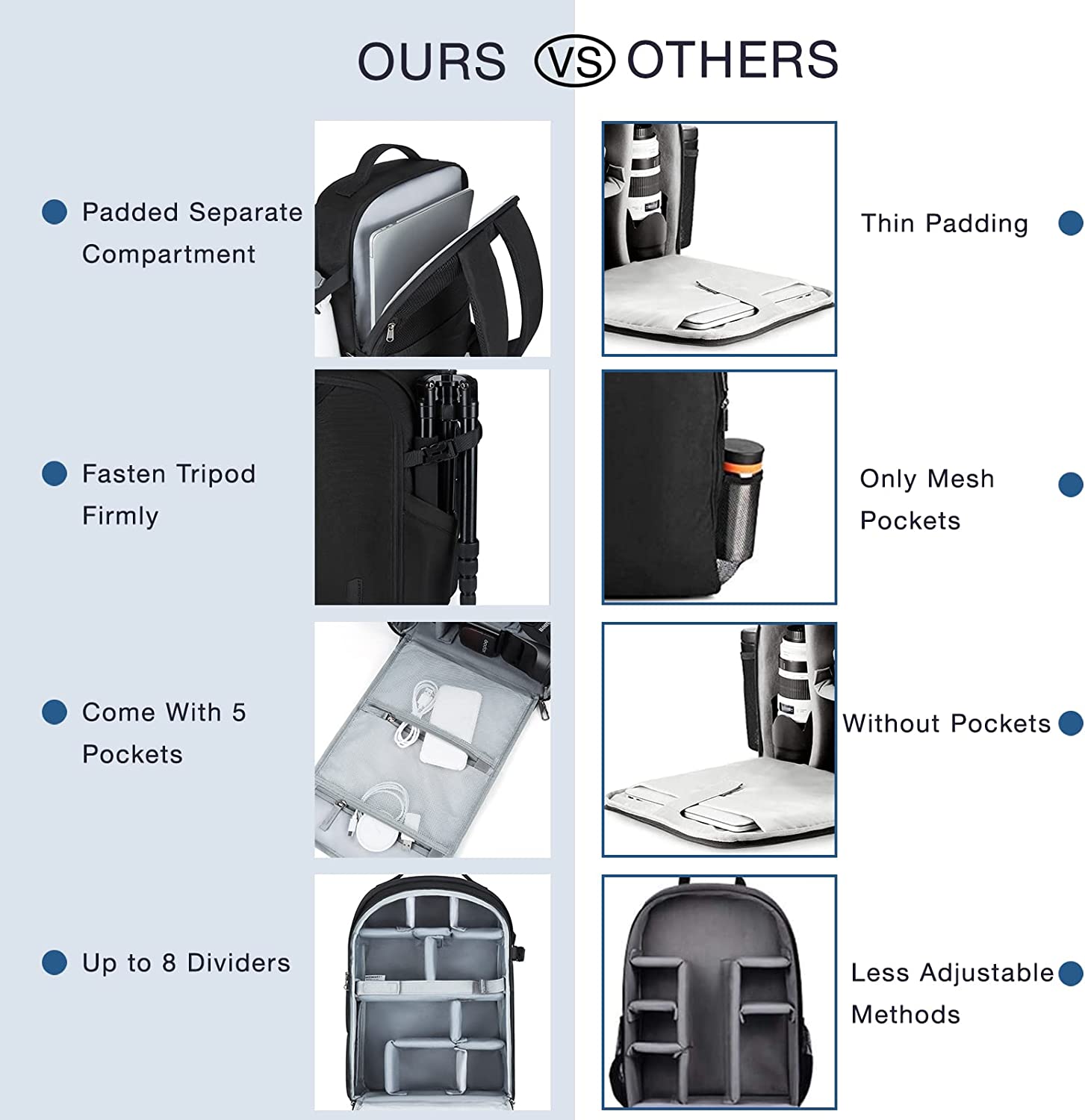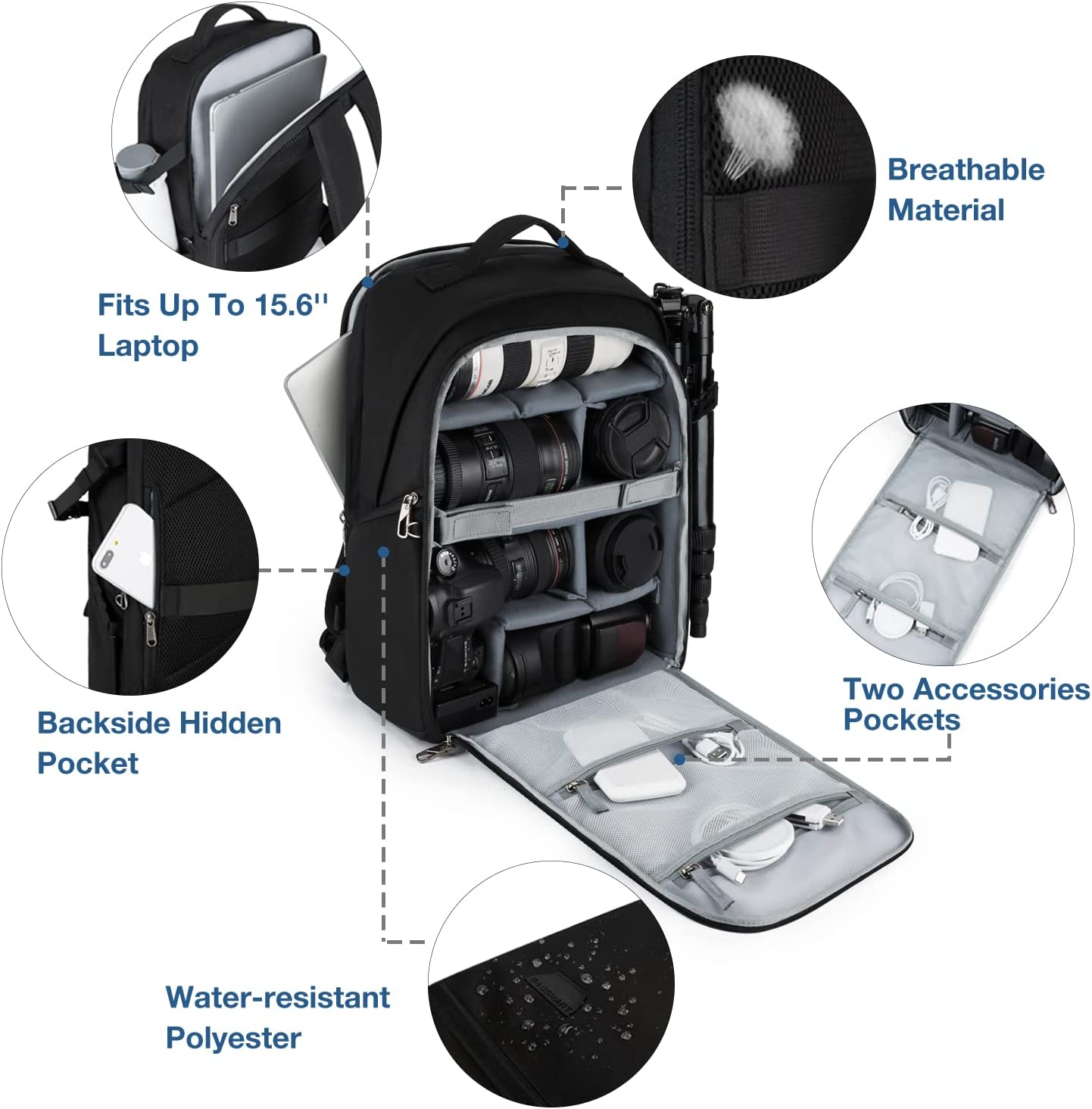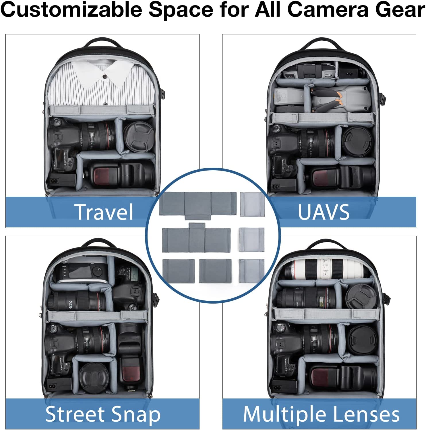 • Customizable Space- 7 removable padded dividers with 1 fixed divider to keep camera kit separated and protected, allow you to customize interior space for different size of camera equipment. Removing dividers can easily be converted from a lightweight camera bag into a laptop backpack.