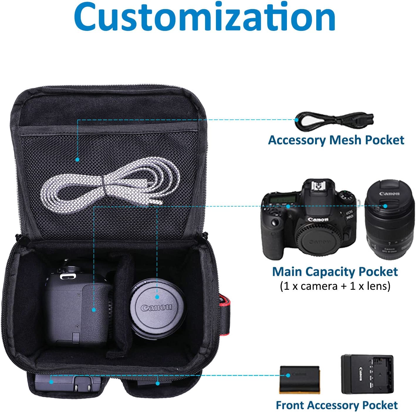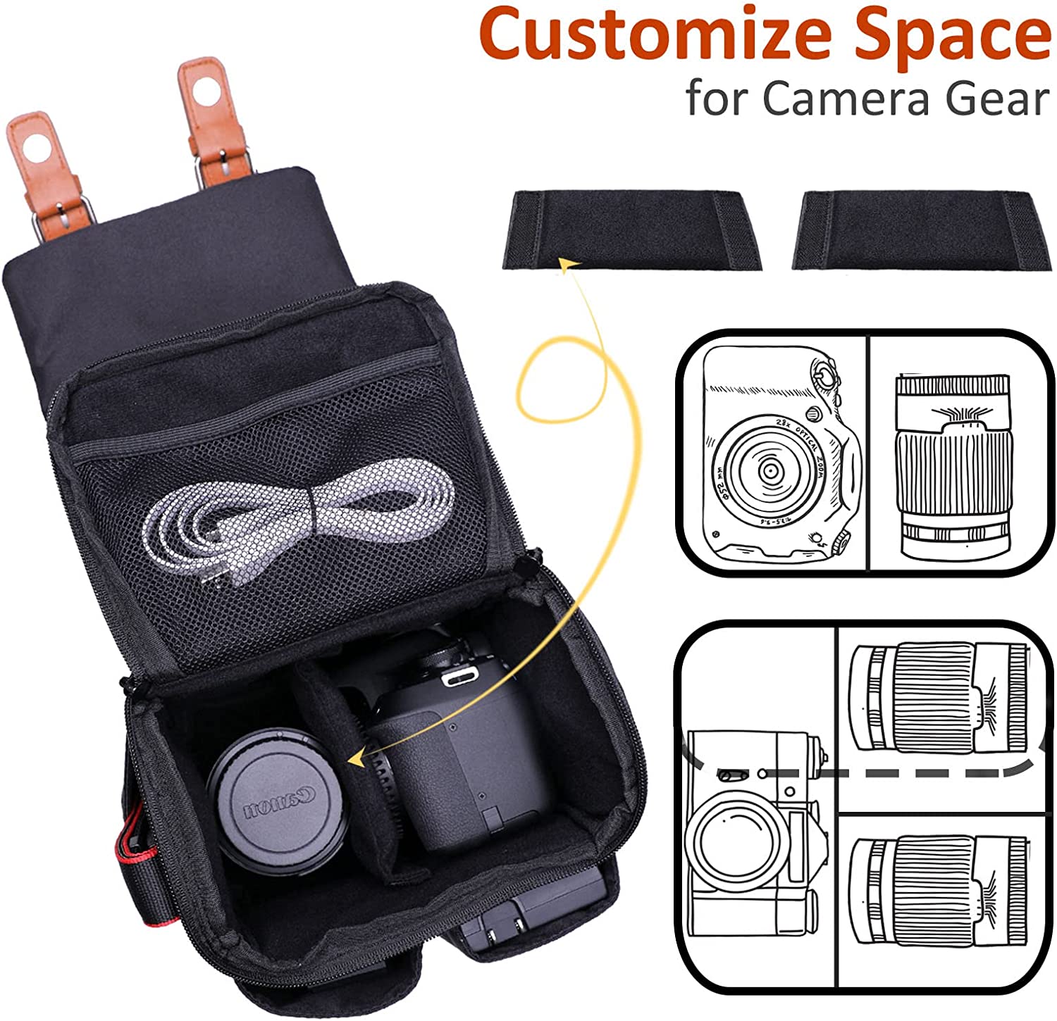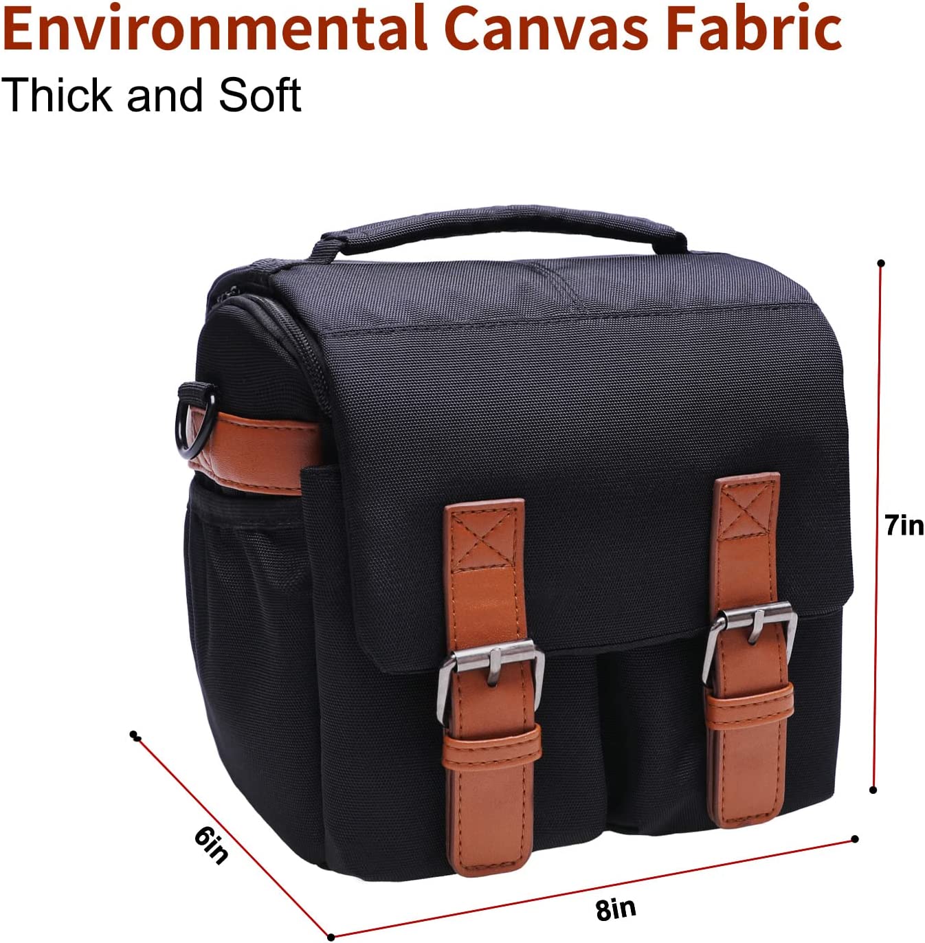 • Perfect Size Camera Bag: External size 8 x 6 x 7 inches, Internal size 7.5 x 5.2 x 6.3 inches. Fits all kinds of camera,such as Canon EOS Rebel T7/Rebel SL3/Rebel T8i/M50 Mark II/90D/2000D/4000D etc.