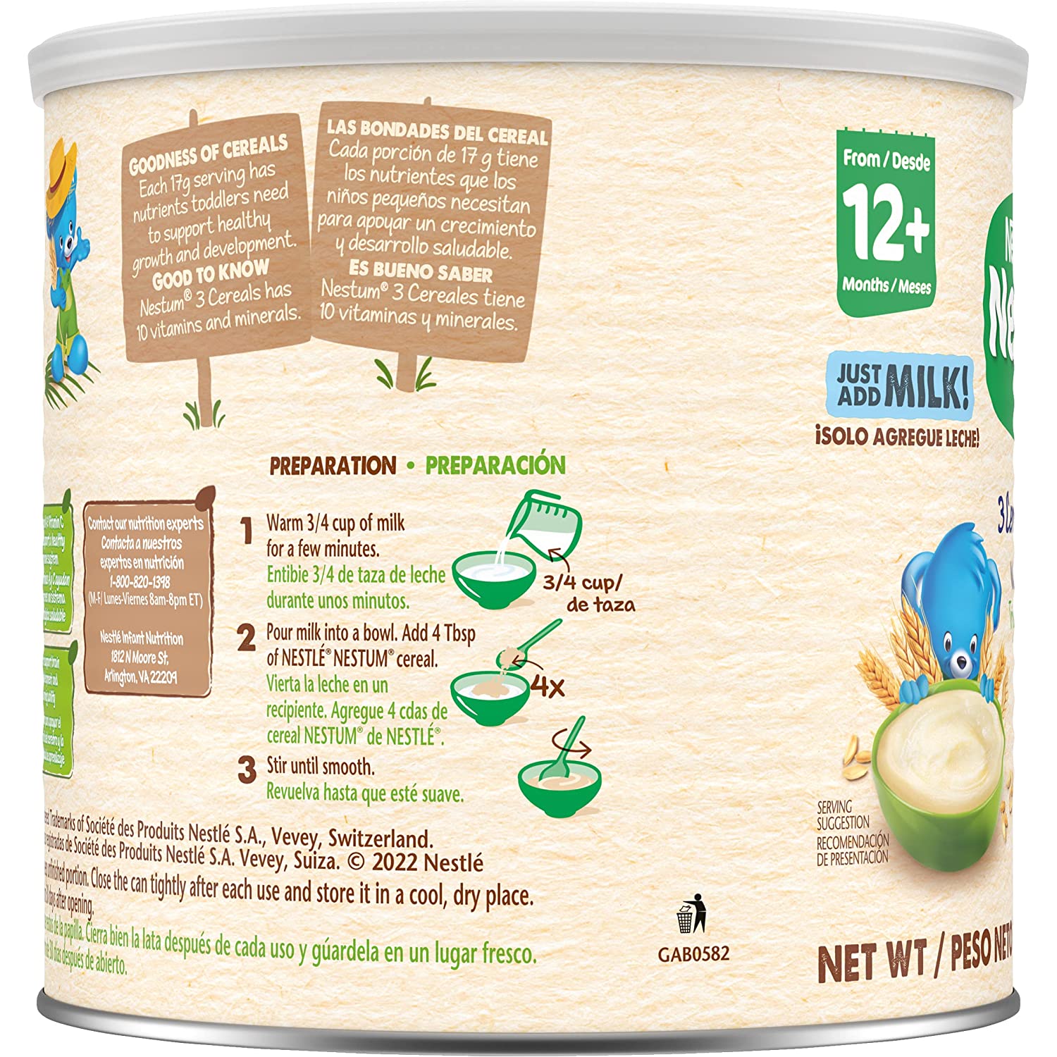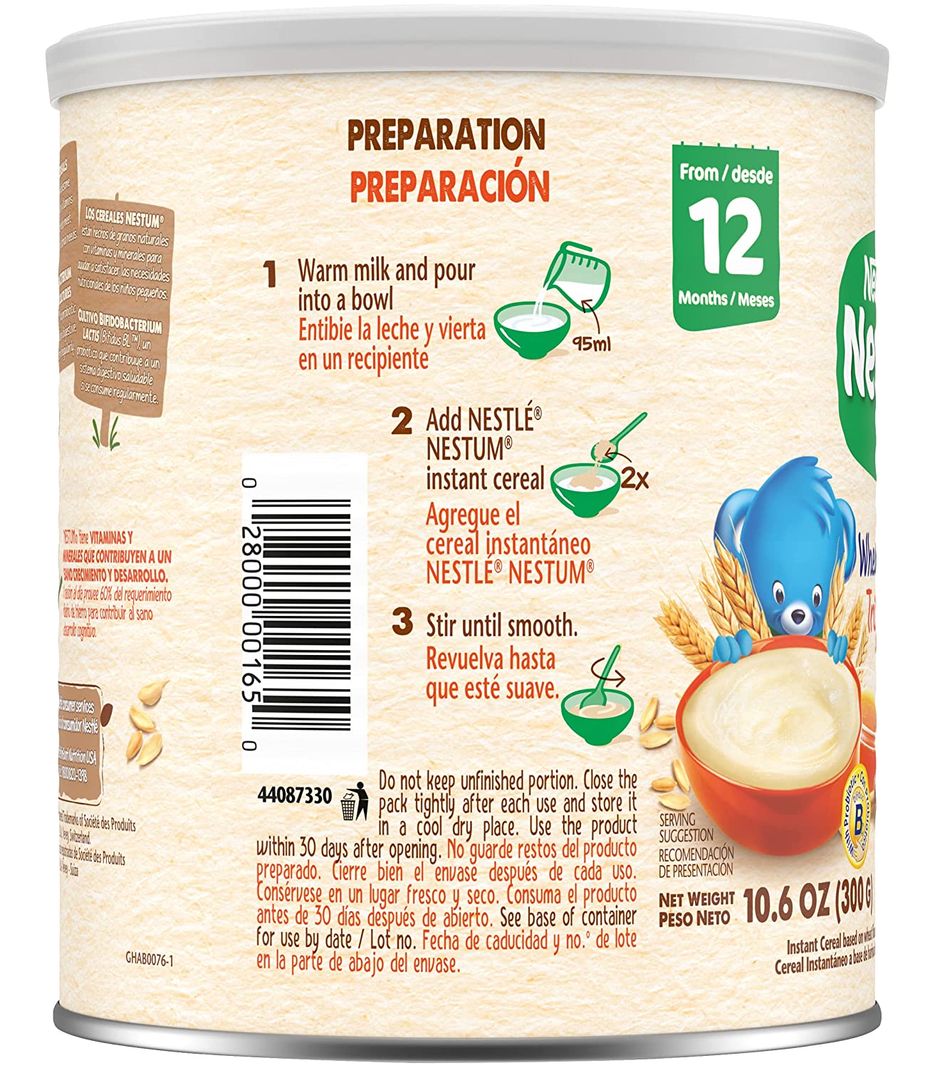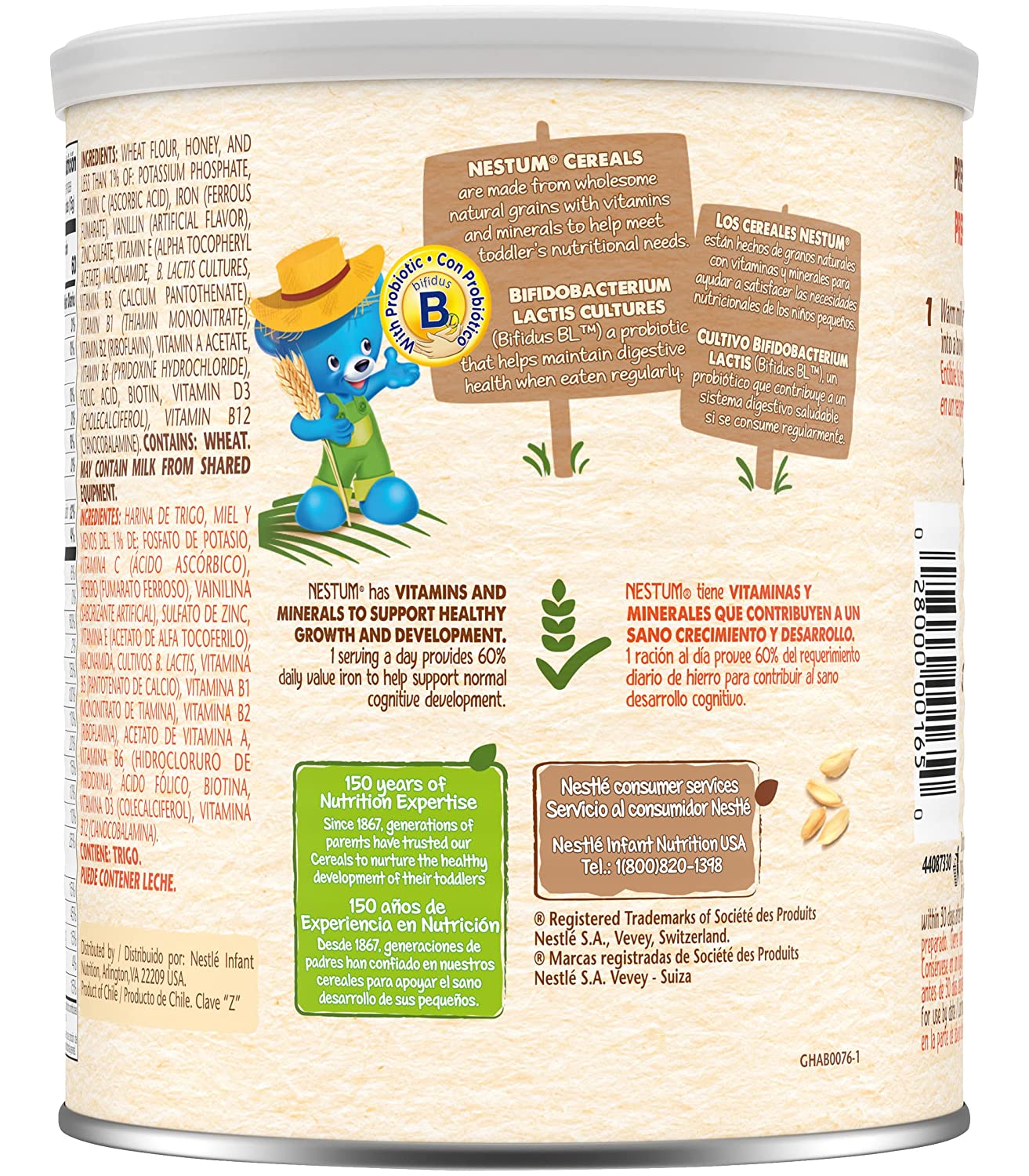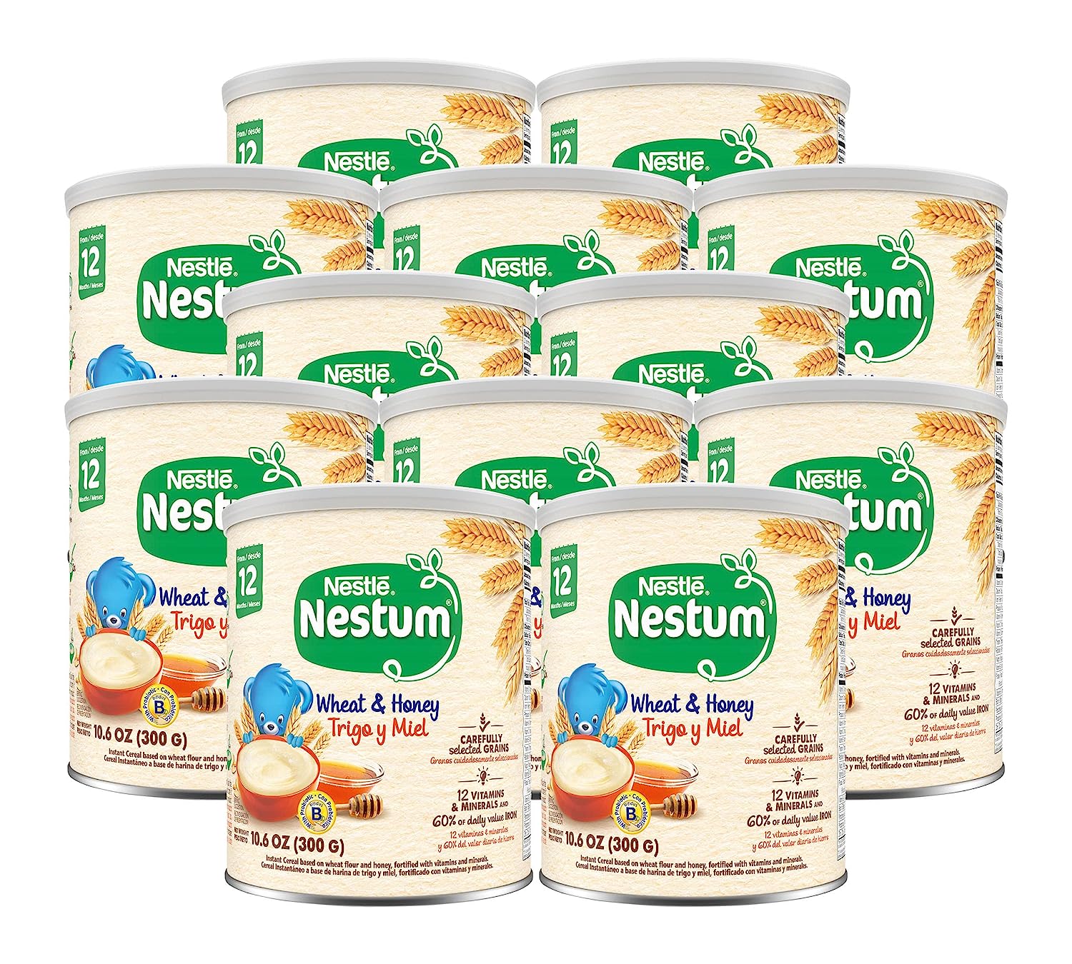 Nestle Nestum Infant Cereal, Wheat & Honey, 10.6 Ounce Canister: Crafted with delicious ingredients to help your little one blossom. This Nestum cereal contains carefully selected grains with 12 vitamins and minerals and 60% daily value of Iron. Great to help support healthy development for your baby. Nestum is made with wholesome grains and vitamins and minerals to support healthy growth, including iron to help support brain development and learning ability. Our cereals are made with wholesome ingredients. Also, they are easy to prepare for a satisfying cereal for your little one. With a range of cereals made for little ones from 6-12+ months, there’s a Nestum product to help nourish little tummies of all ages. This Nestum cereal is made for babies 12+ months.