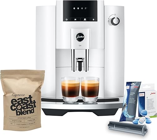 Jura E4 Automatic Coffee Machine (Piano White) with CLEARYL Smart+ Water Filtration, 6 Cleaning Tablets and East Coast Blend Whole Bean Coffee (4 Items)