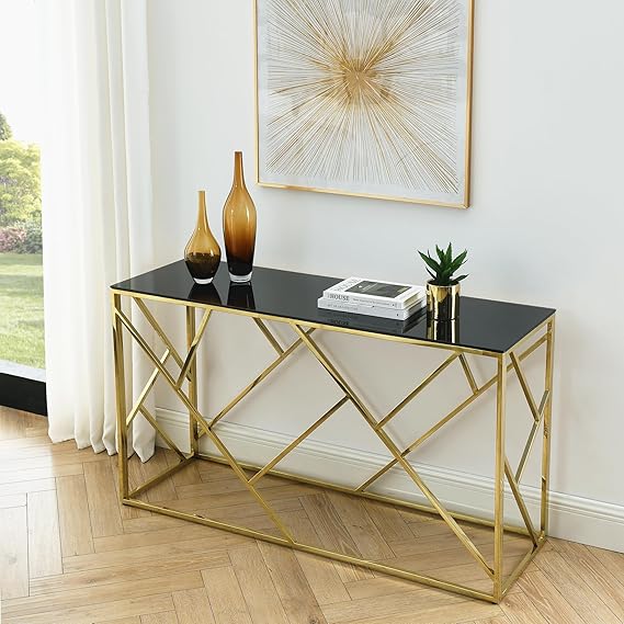 Gold Console Table with Mirrored Stainless Steel Metal Base, Rectangular Tempered Glass Console Table, Rectangle Narrow Console Table Modern Console Table Black Console Table for Entryway Hallway