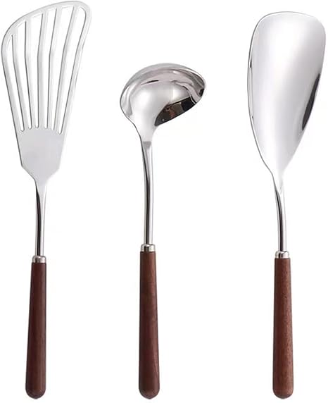 3-Piece Kitchen Utensils Set 18/10 Stainless Steel Cooking Utensils Walnut Wooden Handle Small Kitchen Utensils Gadgets Wok Spatula and Ladle Slotted Turner Spoon Wok Utensils Set