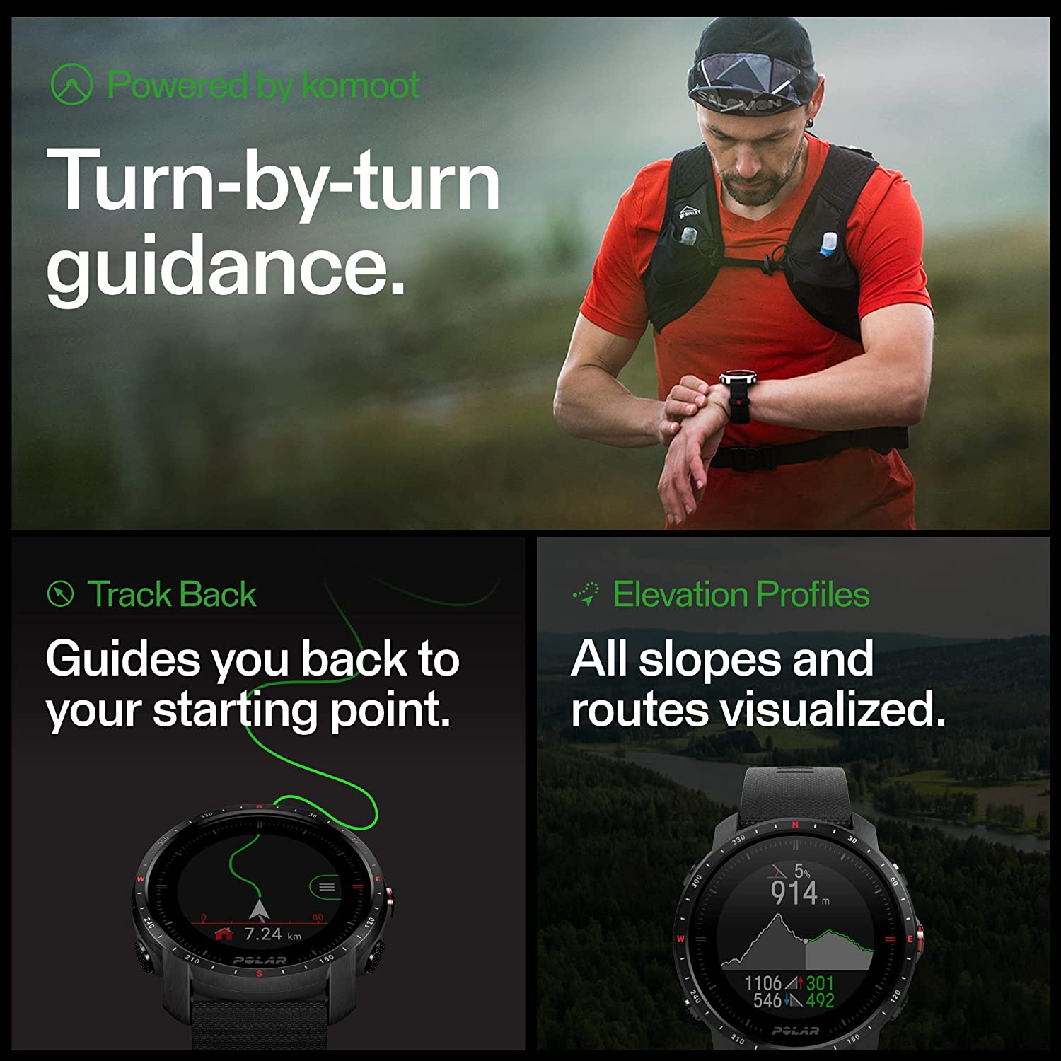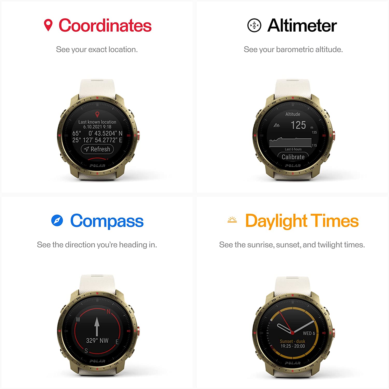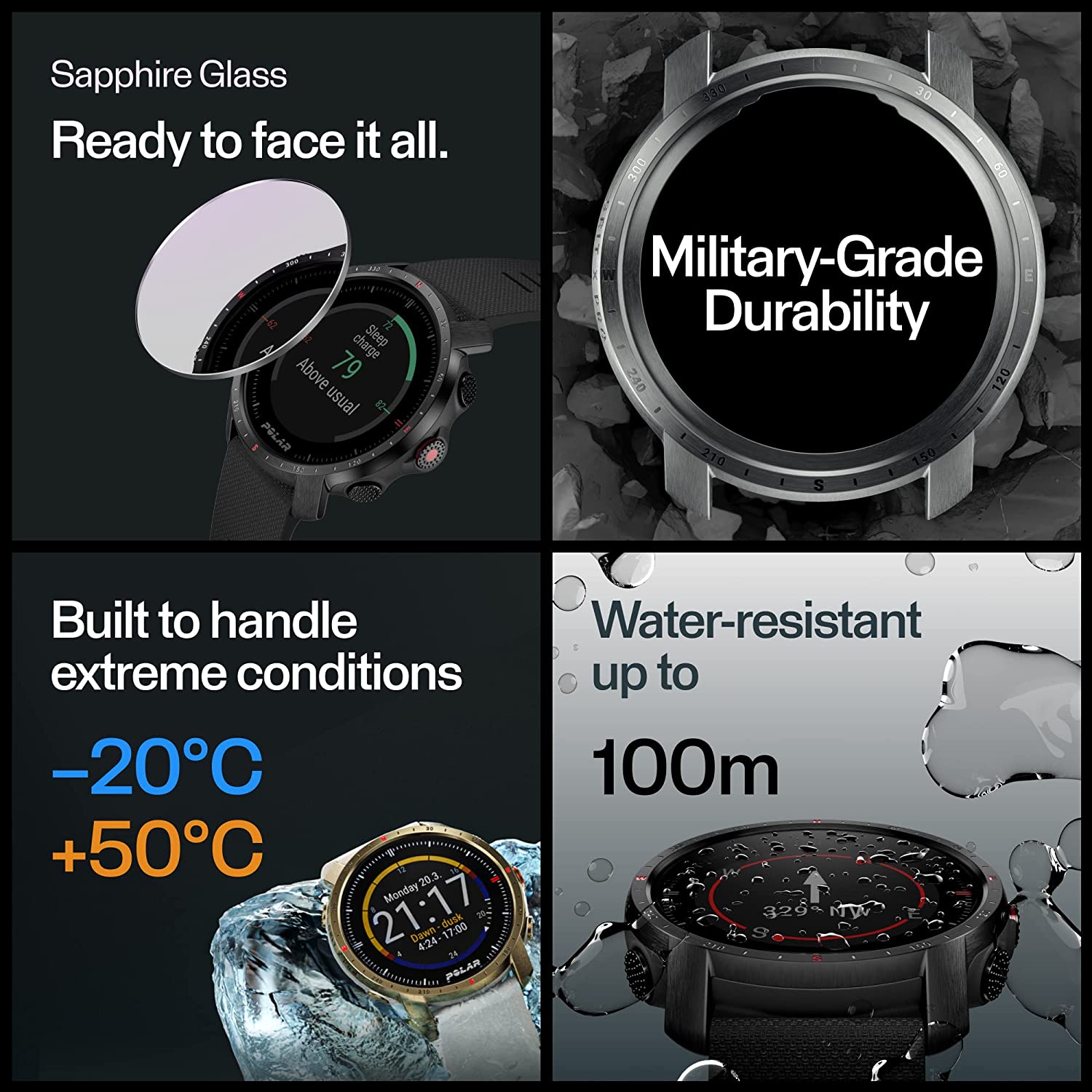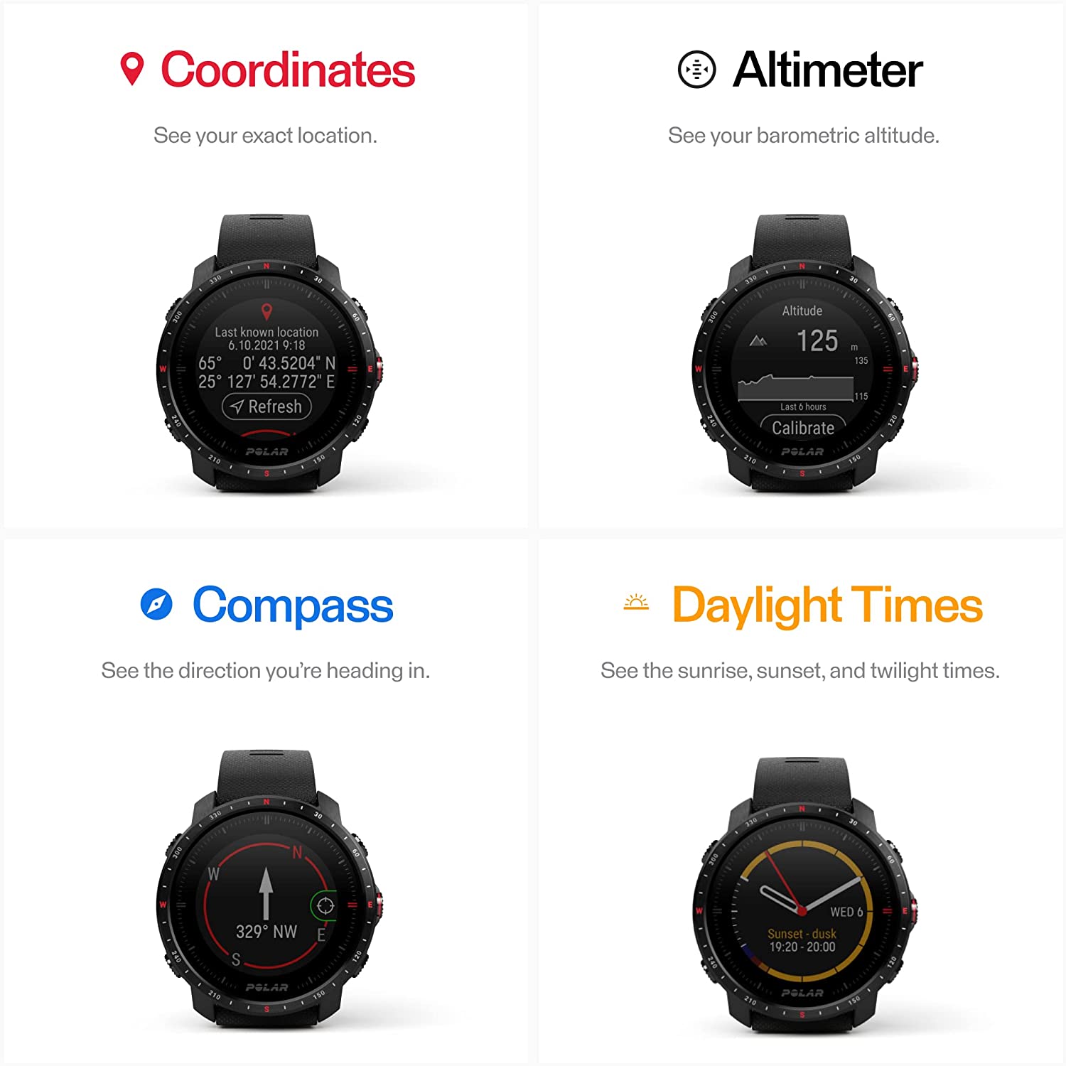 Go Wherever Your Heart Takes You. Handle any environment with military-grade durability and scratch-resistant sapphire glass. Trust your equipment with ultra-long battery and Precision Prime OHR tracking. Know where you stand with turn-by-turn guidance and powerful built-in GPS. Live for adventure with all-new navigation tools, always-on outdoor features, and Polar's ultimate training solutions. Polar Grit X Pro equips you with everything you need to explore the world and understand your body - realizing just how incredible they both are.