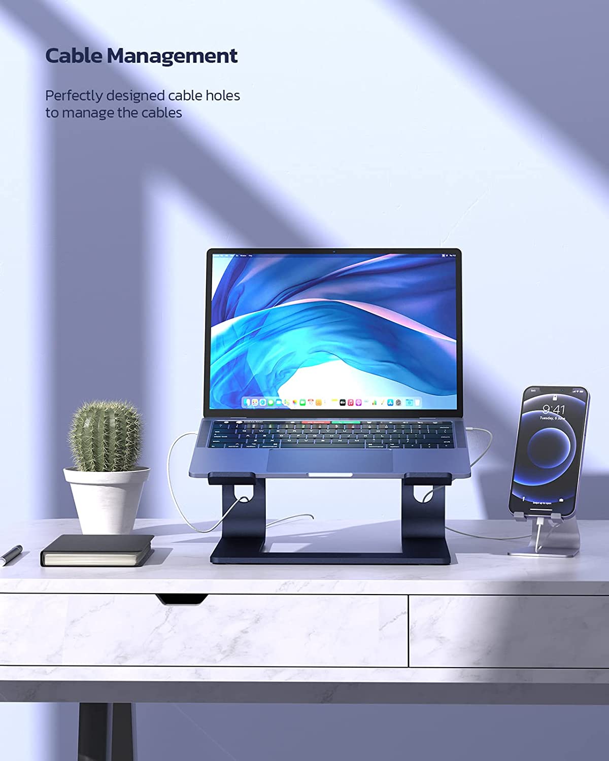 • 【Sturdy & Protective Design】 Made with premium 5mm aluminum alloy this laptop stand is study and is able to support laptop weighing up to 22 lbs (10kg) and with the large rubber pads on the surface it will hold it steady too. We also have pads on the bottom to prevent it from sliding and protecting your laptop from any unwanted harm.