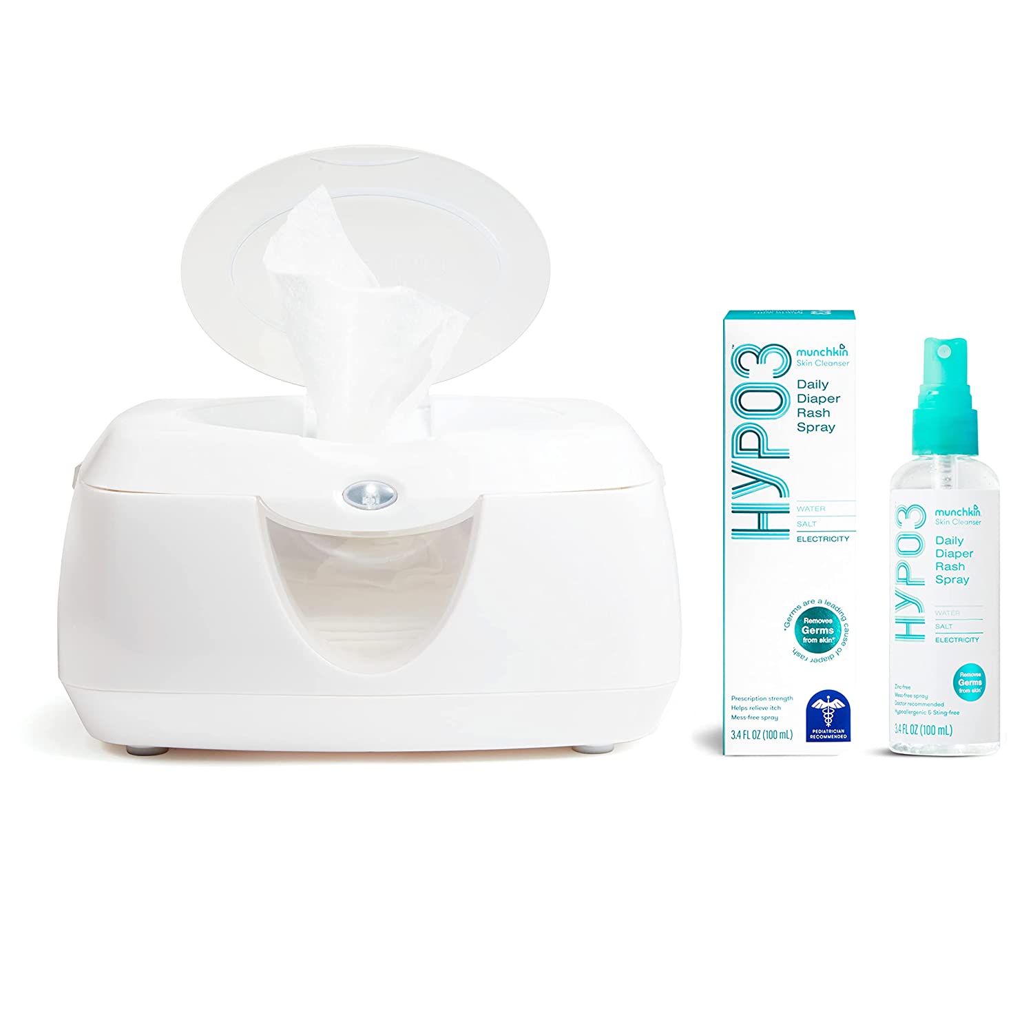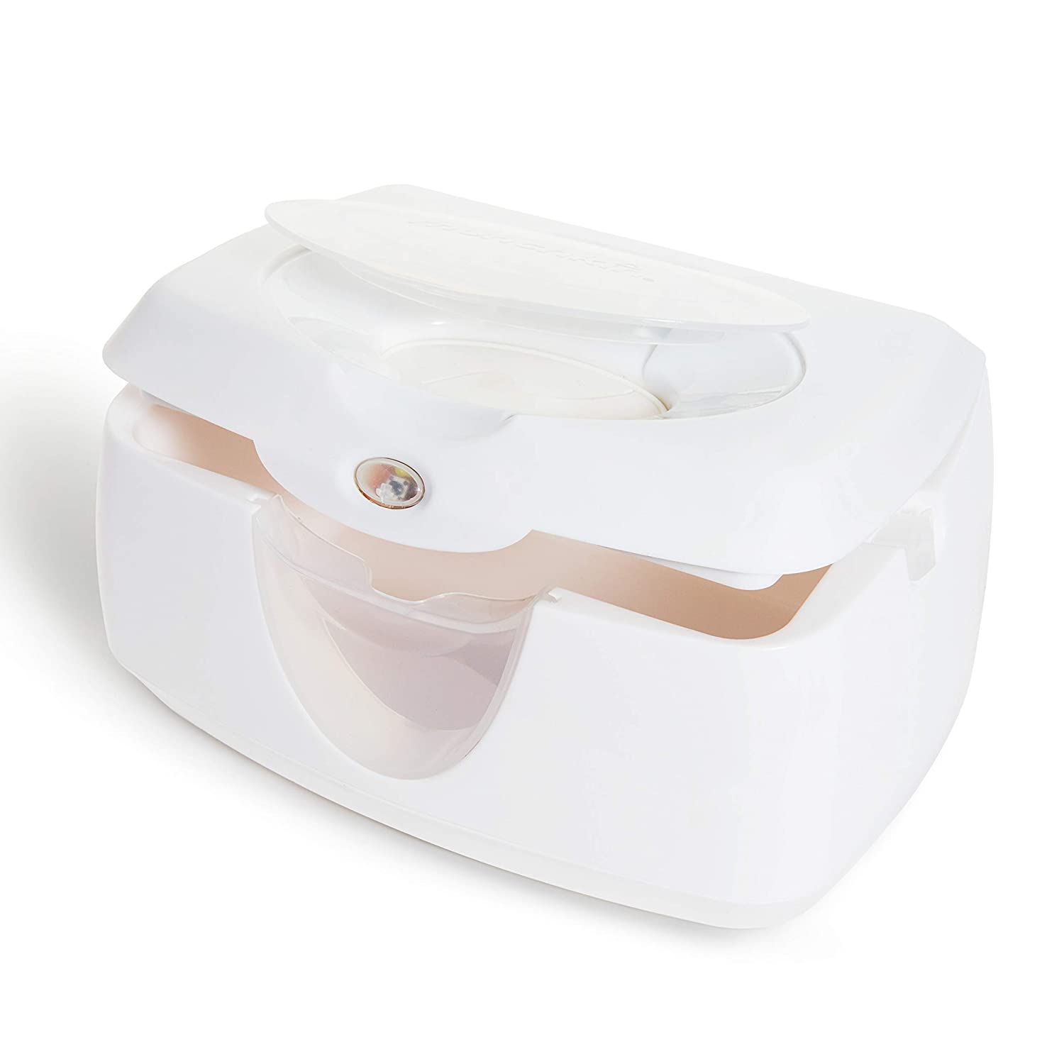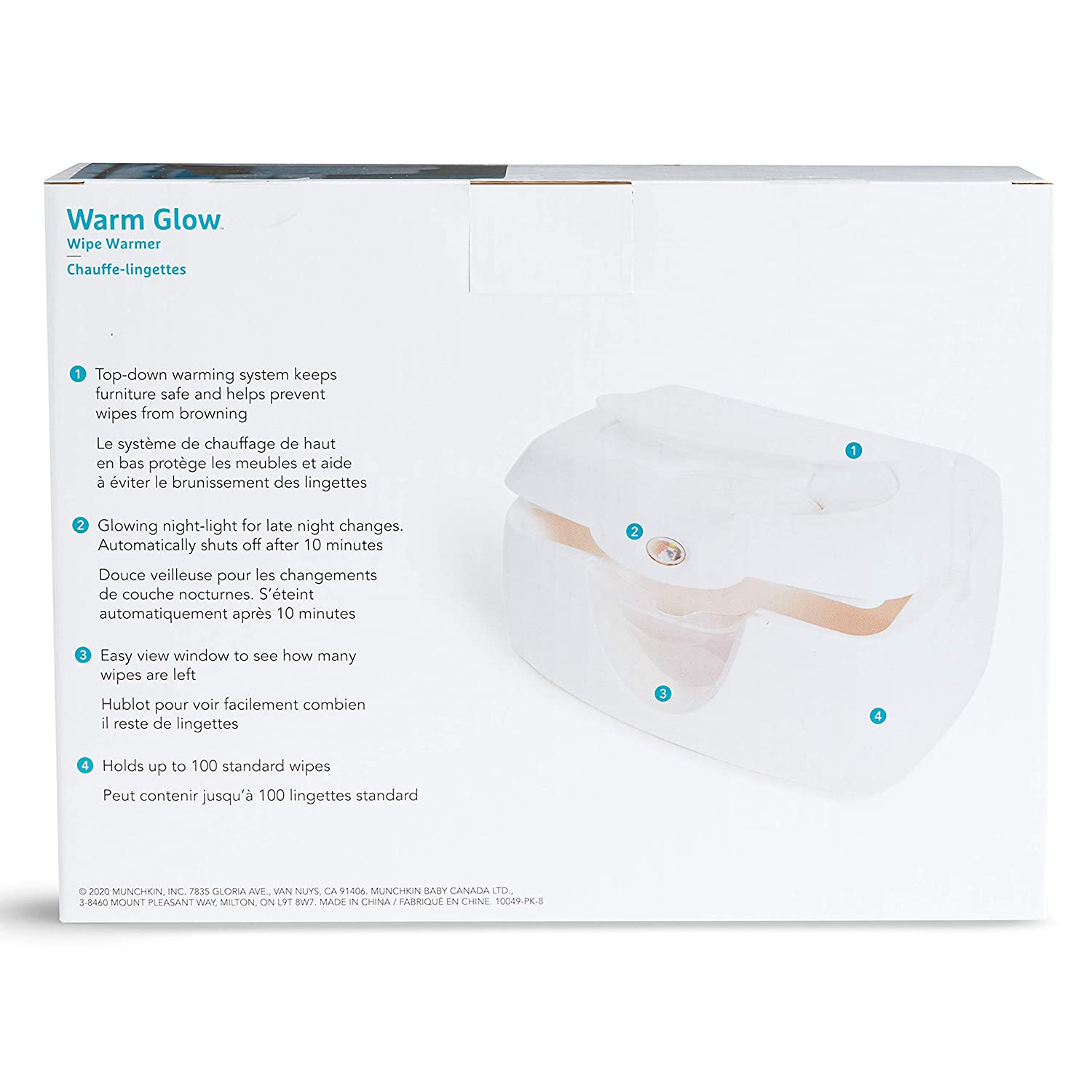 Do ice cold wipes trigger unhappy cries during diaper changes? The Warm Glow Wipe Warmer by Munchkin will soothe baby's bottom and warm mom's heart. Help make diaper changing more enjoyable for your little one with the comfort of a warm wipe. This convenient wipe warming system stores up to 100 standard baby wipes and dispenses them conveniently from a flip top lid. Its low voltage, top down warming system ensures a warm wipe every time without the risk of browning, drying, or discoloration. It also features a soft glow night light that helps with nighttime changes and automatically shuts off after 10 minutes of use. A built in window allows you to keep tabs on your wipes supply without opening the unit, while the tightly sealing system keeps wipes moist over time. • The power adapter is compatible with and should be plugged into a standard household 110 120 volt AC outlet only. Do not plug into a 220 volt or alternative voltage AC outlet. Only use with a Class 2 adapter.